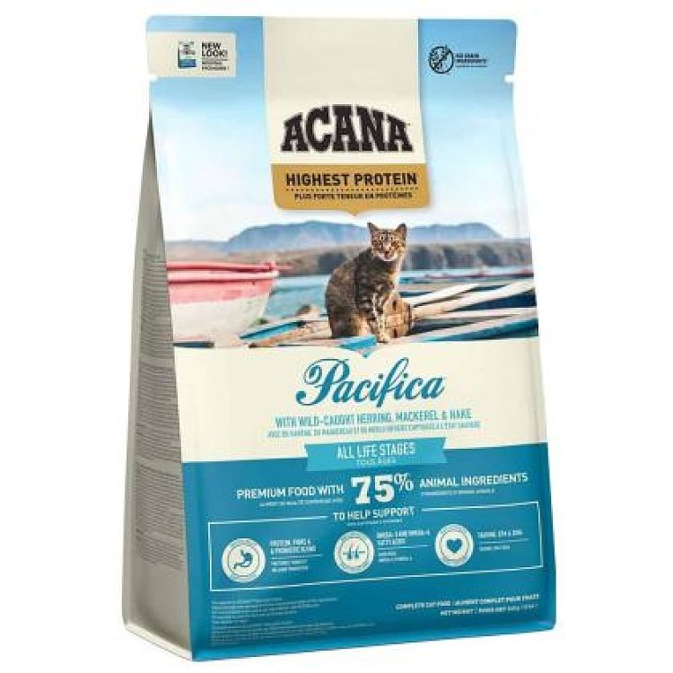 Η ACANA PACIFICA CAT ξεχειλίζει από ρέγγα, σαρδέλα, καλκάνι, silver hake (είδος μπακαλιάρου) και πετρόψαρο. Όλα αλιευμένα στη φύση, παραδίδονται φρέσκα ή ωμά για να αντικατοπτρίζουν τη διατροφή για την οποία έχει πλαστεί η γάτα σας. Συνταγή περιορισμένη σε υδατάνθρακες, ξεχειλίζει από πρωτεΐνη ψαριών και θρέφει τις γάτες για μια βέλτιστη φυσική κατάσταση.