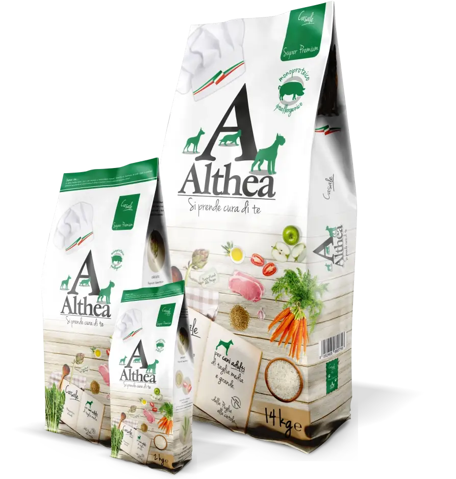 Αποξηραμένο χοιρινό 32%, ρύζι (20%), καλαμπόκι, παράγωγα σιταριού, ζωικό λίπος, φακές (5%), πολτός παντζαριού, μαγιά ζυθοποιίας, λάδι σολομού, εκχύλισμα γιούκας, εκχύλισμα κιχωρίου (1%), αποξηραμένα μήλα (0.2%), αποξηραμένα καρότα (0.15%), ελαιόλαδο (0.13%), αποξηραμένη ντομάτα (0.12%), Αλθαία η κοινή (0.041%), Αγγινάρα (Cynara scolimus hayek) (0.037%), Δενδρολίβανο (Rosmarinus officinalis) (0.035%), Ρίγανη (Origanum vulgare) (0.033%), Σάλβια (Salvia officinalis) (0.031%), σκόνη σκόρδου (0.03%), Ιππουρίδιο (Equisetum arvense) (0.028%).