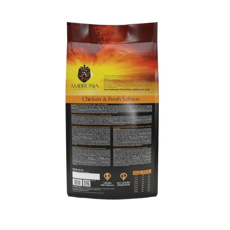 Πλήρης τροφή χωρίς σιτηρά με κοτόπουλο και σολομό για το ενήλικο σκυλάκι σας, ανεξαρτήτου φυλής. Η τροφή αυτή είναι μια πλήρης ολιστική τροφή που συνδυάζει την εύπεπτη πρωτεΐνη από το φρέσκο ψάρι, την υψηλή διατροφική πρωτεΐνη του κρέατος, λαχανικά καθώς και υπερτροφές και βότανα που βοηθούν το ανοσοποιητικό σύστημα των μικρών μας φίλων. Περιέχει ρίζα γιούκα, η οποία ανακουφίζει από την ακαμψία και τον πόνο στις αρθρώσεις. Η γιούκα προωθεί επιπλέον την καρδιαγγειακή υγεία καθώς βελτιώνει την κυκλοφορία του αίματος, μειώνει την πίεση και την χοληστερόλη.