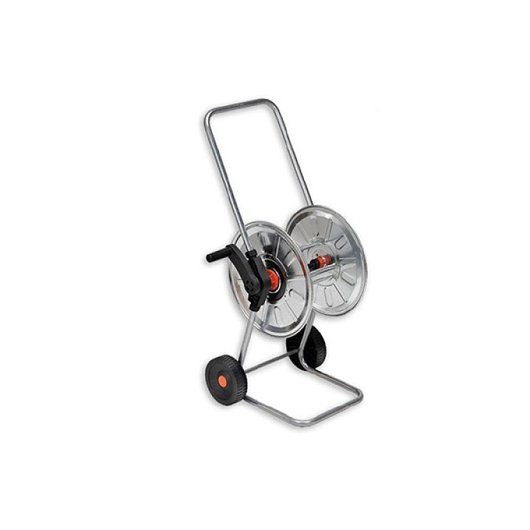 Μεταλλική τροχήλατη ανέμη κατασκευής Ιταλίας με ροδάκια από καουτσούκ για λάστιχο κήπου για μεγαλύτερη ευκολία στην μεταφορά & στο τύλιγμα/ξετύλιγμα και σύνδεσμο υπό γωνία ώστε να μην σπάει ή τσακίζει το λάστιχο. Μπορεί να δεχθεί έως και 50 μέτρα λάστιχο 1/2″