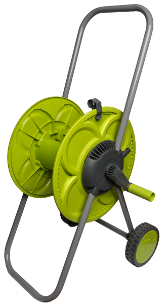 Εύκολη Μετακίνηση: Διαθέτει δύο ρόδες και σταθερή λαβή μεταφοράς σε χρώμα γκρι, επιτρέποντας την άνετη μεταφορά του καρουλιού σε όλο τον κήπο χωρίς κόπο.