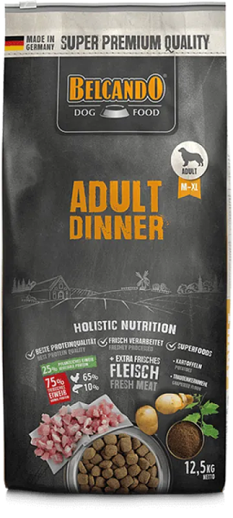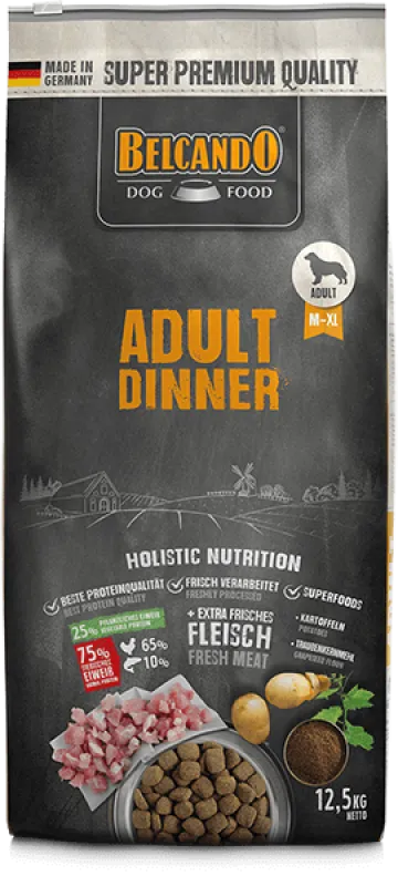 Η προσεκτική επιλογή των πρώτων υλών, η αφθονία σε τρυφερά πουλερικά, οι υγιεινές πατάτες και οι πυρήνες σταφυλιών ψυχρής πίεσης, δίνουν στην BELCANDO ADULT DINNER τον ιδανικό συνδυασμό θρεπτικών συστατικών για ενήλικους σκύλους. Η ιδανική περιεκτικότητα πρωτεϊνών και λίπους είναι προσαρμοσμένη στις ανάγκες των σκύλων με φυσιολογικά επίπεδα δραστηριότητας. Εάν δίνεται τη σωστή ποσότητα, το σωματικό βάρος του σκύλου θα παραμείνει σταθερό και το επίπεδο κορεσμού θα είναι κατάλληλο. Το σχήμα των κροκετών ενθαρρύνουν τον σκύλο να τις μασάει.