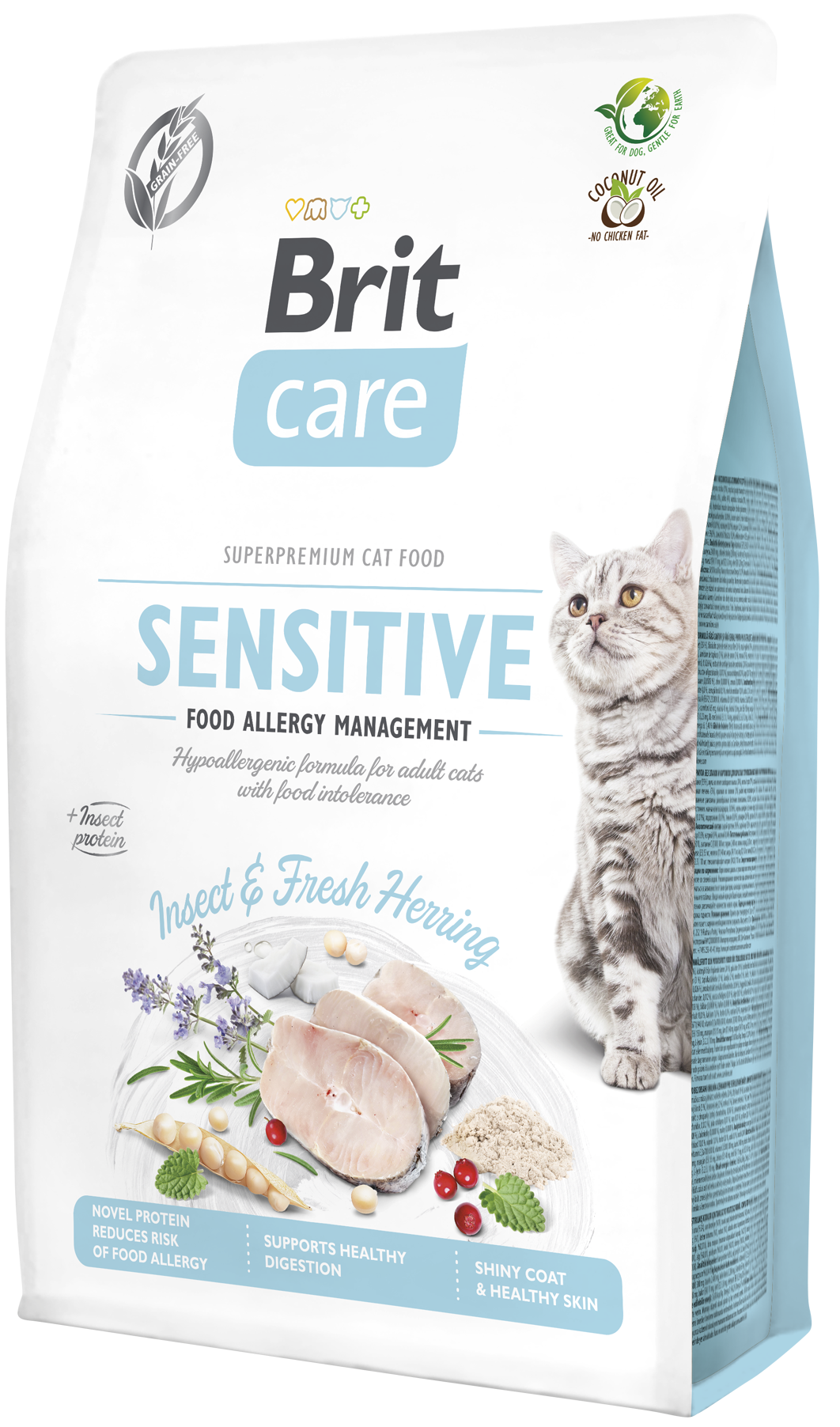 Υποαλλεργική τροφή χωρίς δημητριακά, με πρωτεΐνη εντόμων και φρέσκια ρέγγα, ειδικά σχεδιασμένη για γάτες με τροφική δυσανεξία.