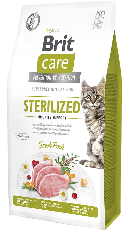 Η Brit Care Cat Sterilized είναι μια premium grain-free τροφή με υποαλλεργική σύνθεση, ειδικά σχεδιασμένη για στειρωμένες γάτες. Βασίζεται στο φρέσκο χοιρινό κρέας, προσφέροντας υψηλής ποιότητας πρωτεΐνες που υποστηρίζουν τη μυϊκή μάζα, ενώ παράλληλα διατηρεί το ιδανικό σωματικό βάρος.