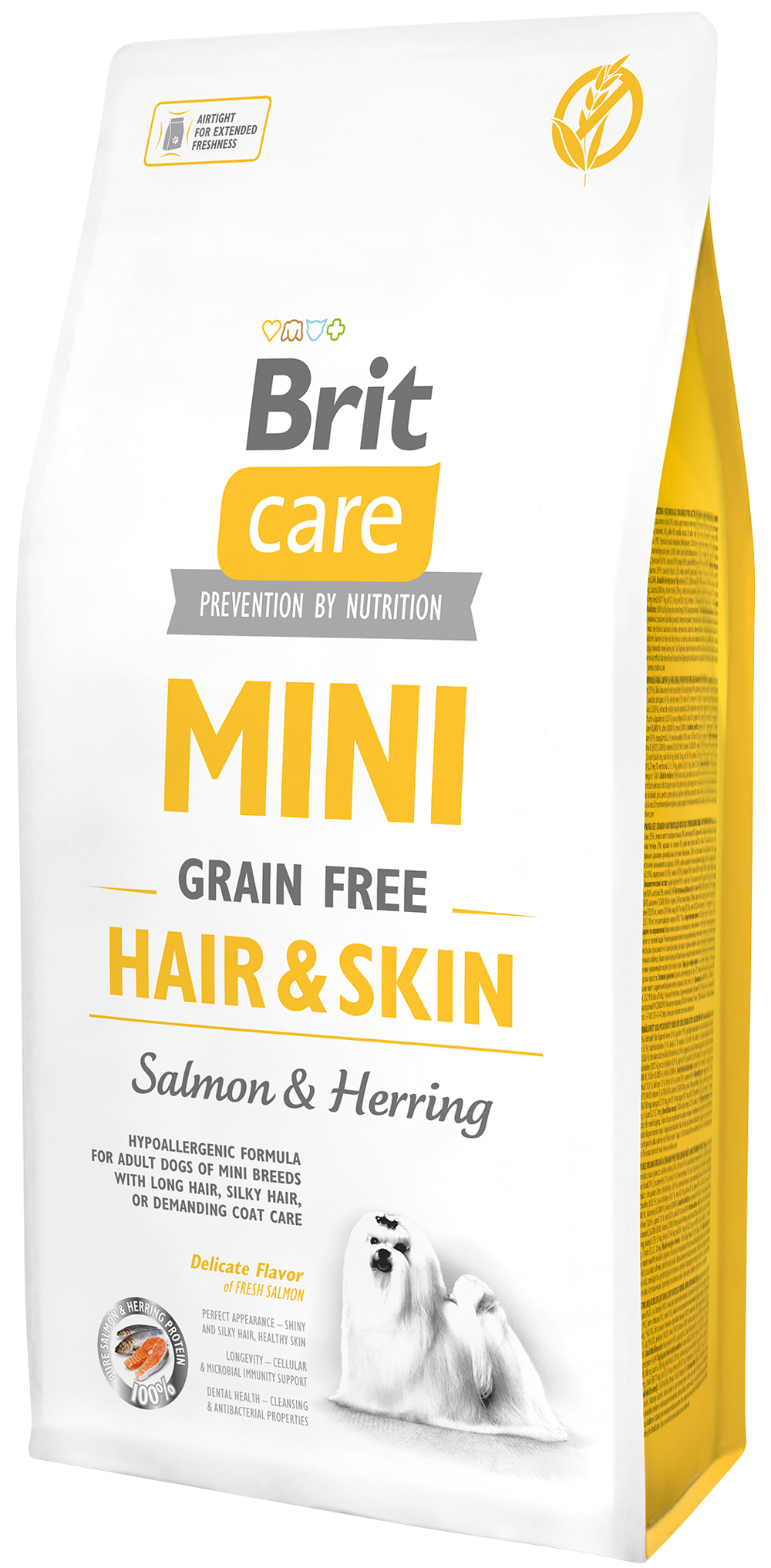 Η Brit Care Mini Grain Free Hair & Skin υποστηρίζει τη φυσική υγεία του δέρματος και του τριχώματος με νωπό σολομό και ρέγγα. Περιέχει ωμέγα-3 και ωμέγα-6 λιπαρά οξέα, ενώ η συνταγή της προάγει τη μακροζωία και την ανοσία του οργανισμού.