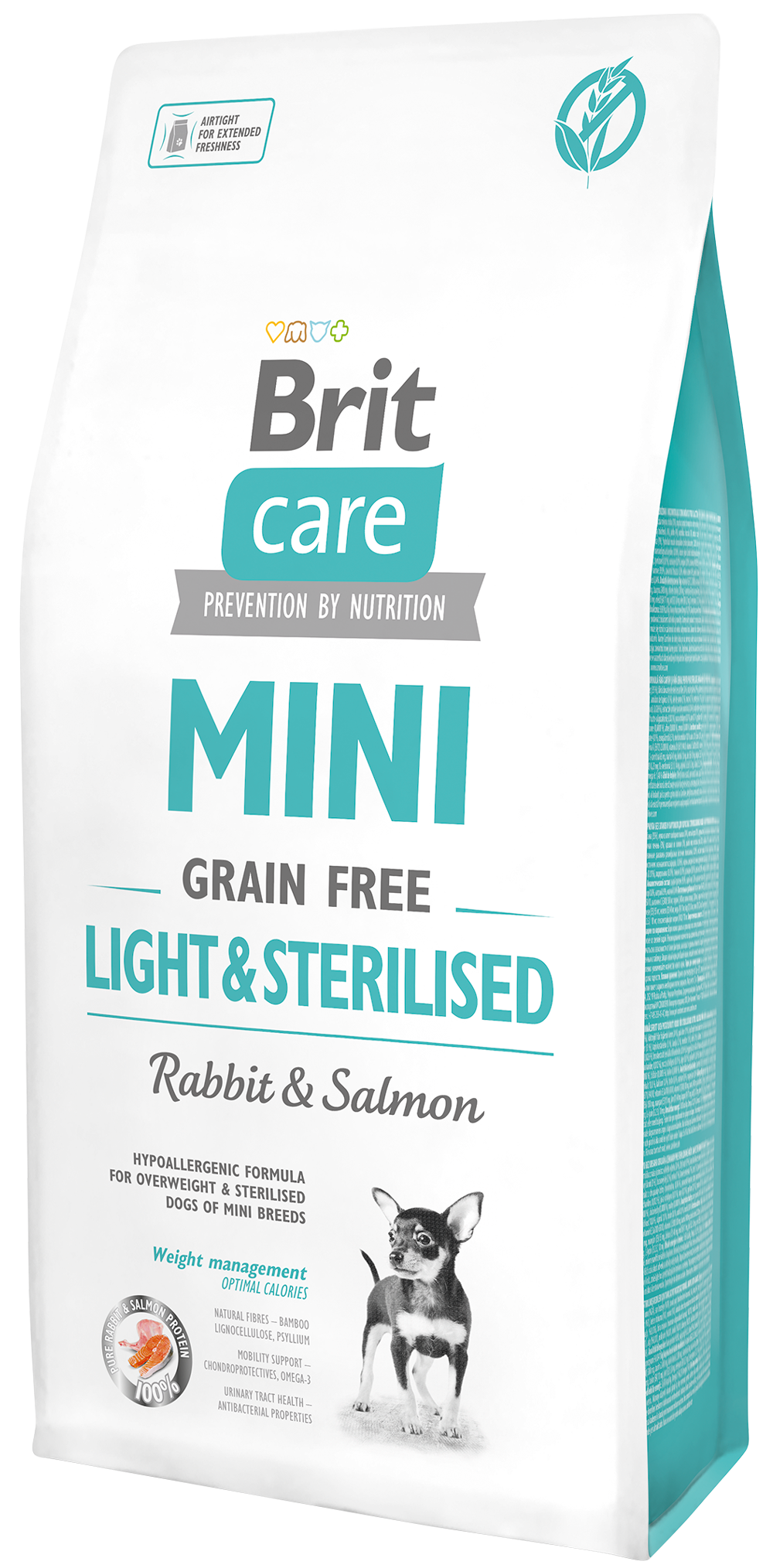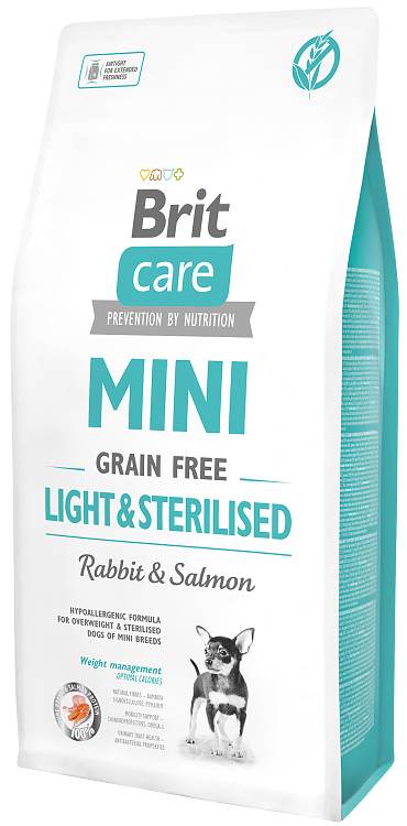 Η Brit Care Mini Grain Free Light & Sterilised υποστηρίζει τους μικρόσωμους σκύλους που είναι στειρωμένοι ή υπέρβαροι, με φυσικές ίνες και θρεπτικά συστατικά για καλύτερη πέψη και έλεγχο βάρους. Περιέχει νωπό κρέας κουνελιού και σολομό για γεύση και ποιότητα, καθώς και χονδροπροστατευτικά για τη κινητικότητα.