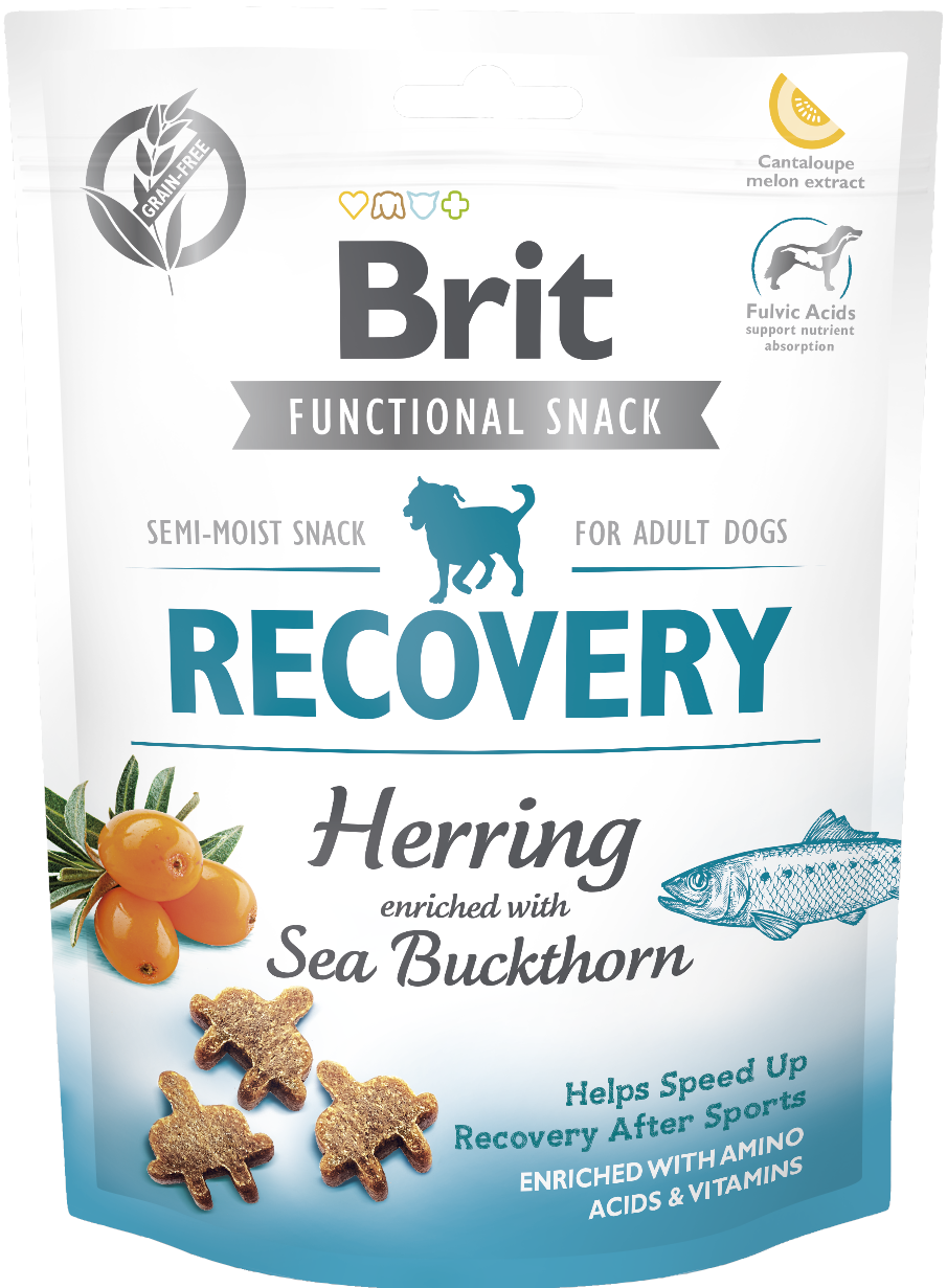 Το "Brit Functional Snack Recovery" είναι ένα grain-free και χωρίς πατάτα σνακ, εμπλουτισμένο με ρέγγα και ιπποφαές. Η ρέγγα παρέχει ωμέγα-3 λιπαρά οξέα, απαραίτητα για τη σωστή λειτουργία του καρδιοαγγειακού συστήματος. Το ιπποφαές, πλούσιο σε βιταμίνη C και αντιοξειδωτικά, συμβάλλει στην ενίσχυση του ανοσοποιητικού συστήματος και στην επιτάχυνση της επούλωσης των πληγών. Επιπλέον, το σνακ περιέχει φουλβικό οξύ για την ενίσχυση της απορρόφησης των θρεπτικών ουσιών και εκχύλισμα πεπονιού Κανταλούπε ως πηγή αντιοξειδωτικών. Είναι ιδανικό για καθημερινή χρήση ως επιβράβευση κατά την εκπαίδευση ή ως λιχουδιά κατά τη διάρκεια της ημέρας.