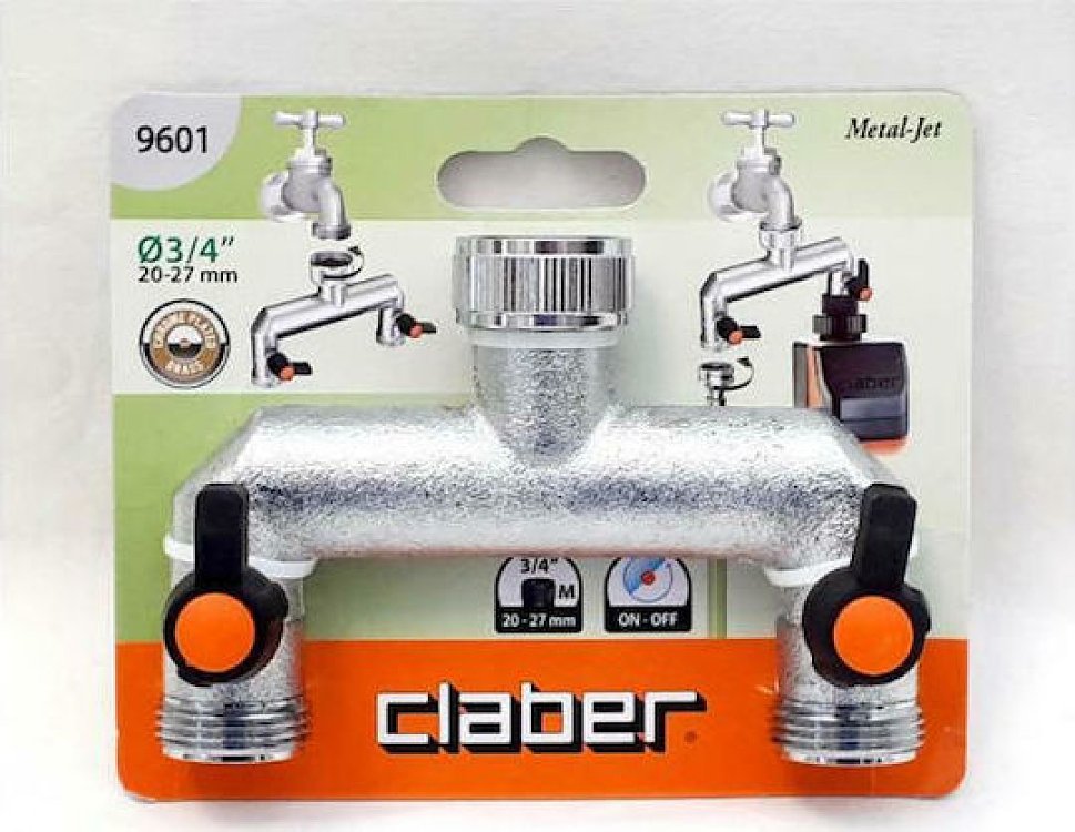 Η διπλή παροχή για βρύσες με σπείρωμα 3/4" της εταιρείας Claber , επιτρέπει την ροή δύο χρονομέτρων νερού. Είναι μεταλλική από ορείχαλκο ένα σκληρό και ανθεκτικό υλικό, που διατηρεί την γυαλάδα του χωρίς να οξειδώνεται από τις καιρικές συνθήκες και τις ακτίνες του ήλιου.