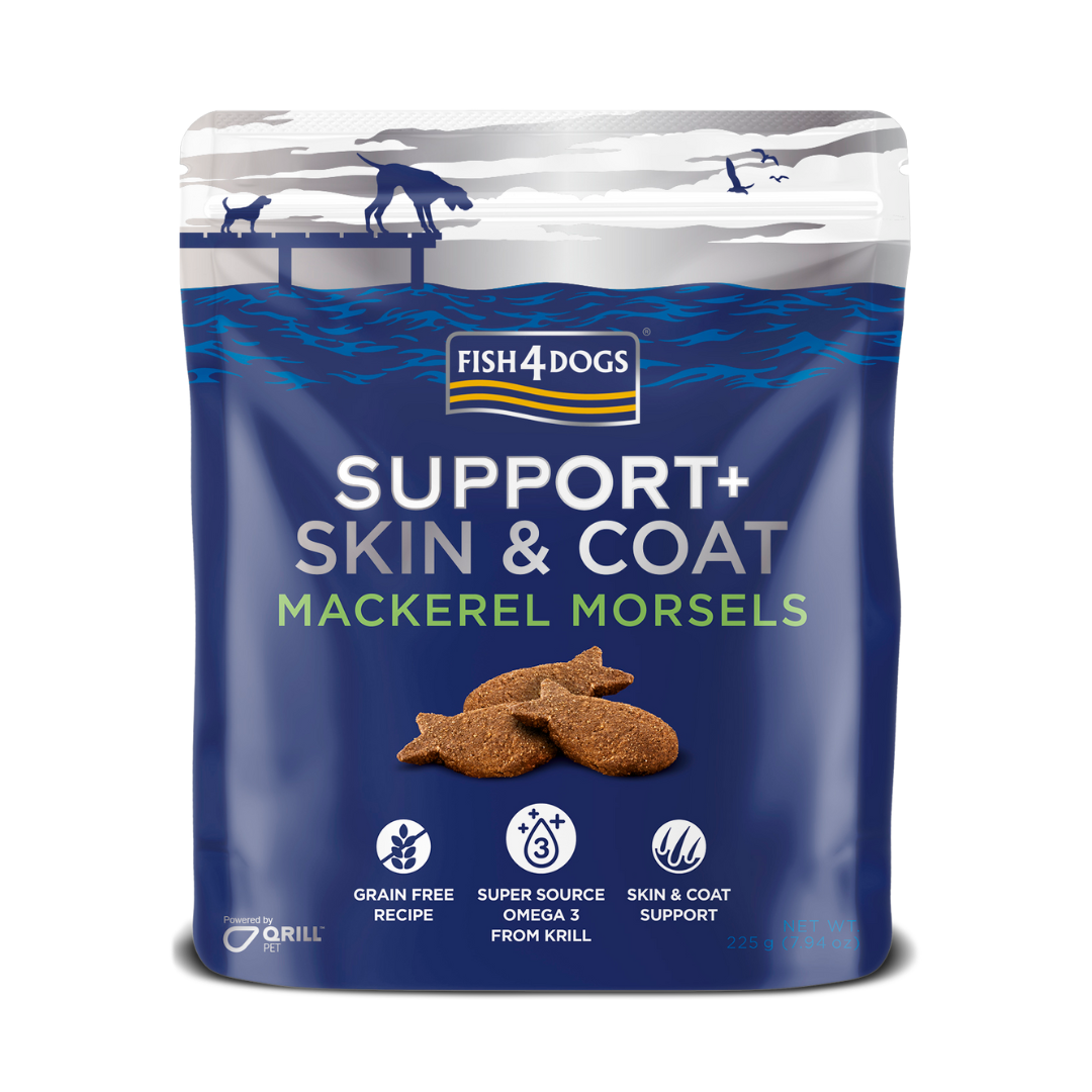 Οι μπουκιές σκουμπριού Fish4Dogs Support+ ADULT Skin & Coat Mackerel Morsels είναι λιχουδιές σε σχήμα ψαριού, με βάση το μπισκότο, για ενήλικα σκυλιά. Φτιαγμένες με σκουμπρί, γλυκοπατάτα και ωφέλιμα Ωμέγα 3 και εμπλουτισμένες με το φυσικό θαλάσσιο συμπλήρωμα Krill για την υποστήριξη της κατάστασης του δέρματος και του τριχώματος του σκύλου.