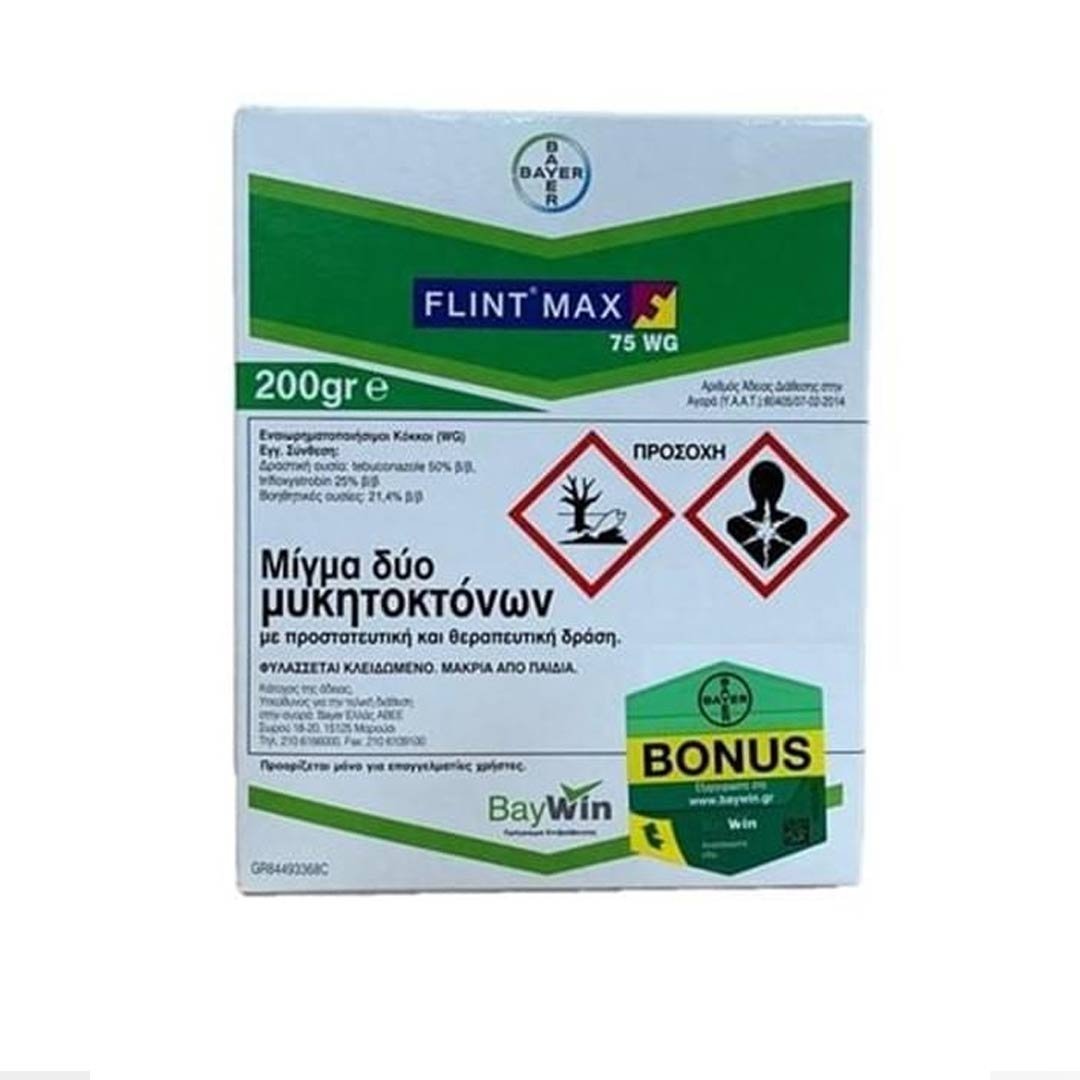 Τρόπος Δράσης: Το Flint Max 75 WG είναι μίγμα δυο μυκητοκτόνων με προστατευτική και θεραπευτική δράση: του trifloxystrobin που εμφανίζει διελασματική και τοπικά διασυστηματική κίνηση καθώς και αξιόλογη δράση με ατμούς και του tebuconazole που εμφανίζει διασυστηματική κίνηση. Το trifloxystrobin, είναι συνθετικό παράγωγο των φυσικών στρομπιλουρινών με διελασματική δράση. Οι στρομπιλουρίνες παρεμποδίζουν τη μιτοχονδριακή αναπνοή, διακόπτοντας τη μεταφορά των ηλεκτρονίων στην κυτοχρωμική αλυσίδα.Το tebuconazole σε βιοχημικό επίπεδο δρα παρεμποδίζοντας τη βιοσύνθεση εργοστερόλης στη θέση της απομεθυλίωσης του C-14 (Demethylation Inhibitors – DMIs).