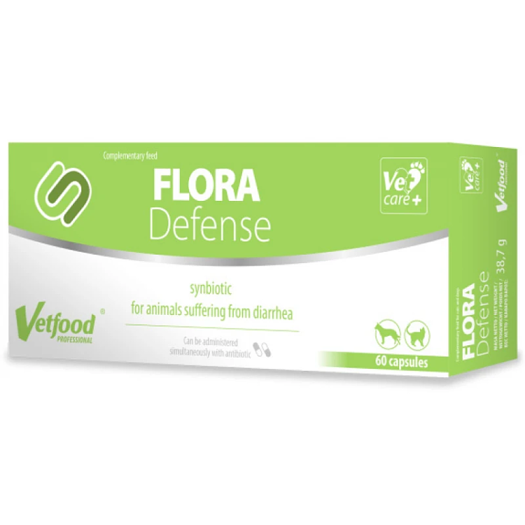 Το Vetfood Flora Defense 60caps είναι ένα συμπλήρωμα διατροφής (συνβιοτικό) για σκύλους, γάτες και μικρά κατοικίδια, σχεδιασμένο για την υποστήριξη της εντερικής υγείας και την πρόληψη ή αντιμετώπιση της διάρροιας, ιδιαίτερα όταν σχετίζεται με αντιβιοτική αγωγή.