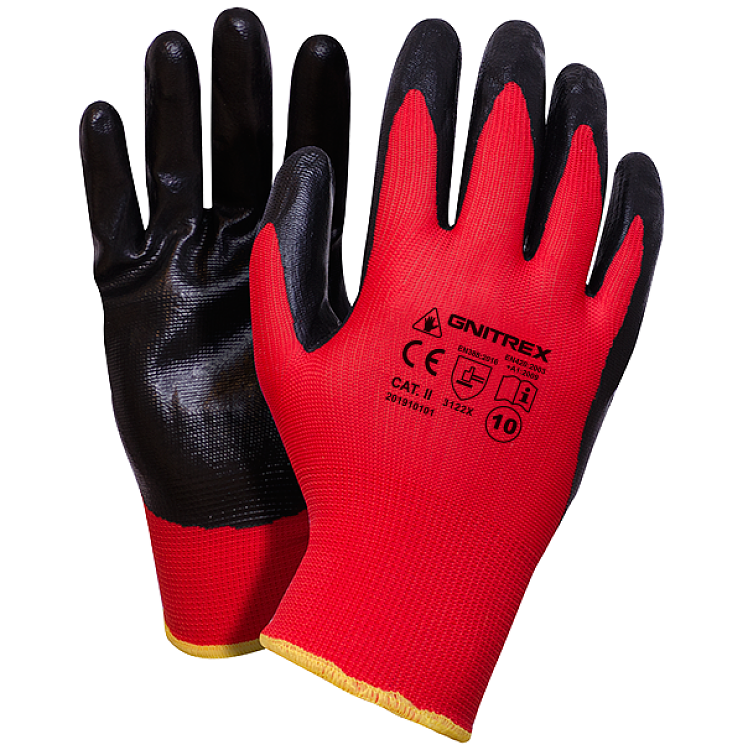 Γάντια ασφαλείας πλεκτά από κόκκινο νήμα πολυεστέρα. Παλάμη επικαλυμμένη με νιτρίλιο, μαύρου χρώματος.