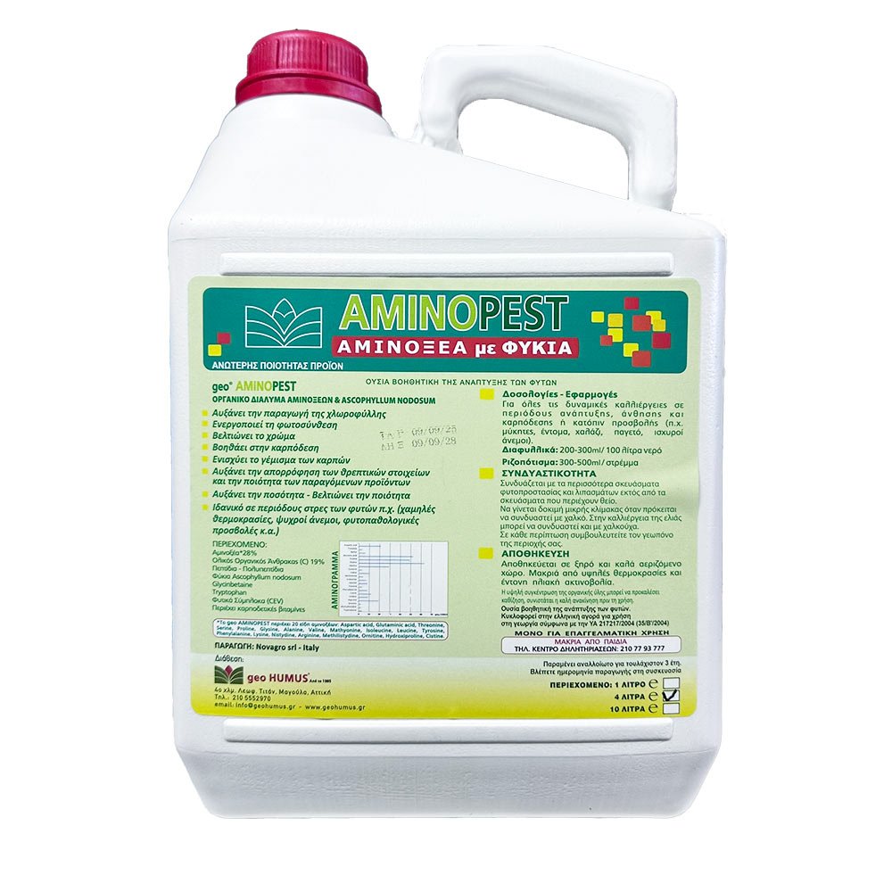 To Geo Aminopest περιέχει και τα 20 αμινοξέα. Ενισχύει την ανθοφορία και την καρποφορία, αυξάνει την πρόσληψη θρεπτικών συστατικών και την αποτελεσματικότητα των φυτοφαρμάκων. Ιδανικό σε περιόδους στρες των φυτών (χαμηλές θερμοκρασίες, ισχυροί άνεμοι, φυτοπαθολογικές προσβολές, χαλάζι κ.λπ.)