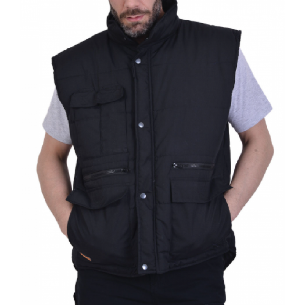 Γιλέκο ψύχους μαύρο. Το ύφασμά του αποτελείται από 80% polyester και 20% βαμβάκι. Διαθέτει θερμομονωτική επένδυση πολυεστέρα, πολλές τσέπες και δύο ειδικές τσέπες για κινητά.
