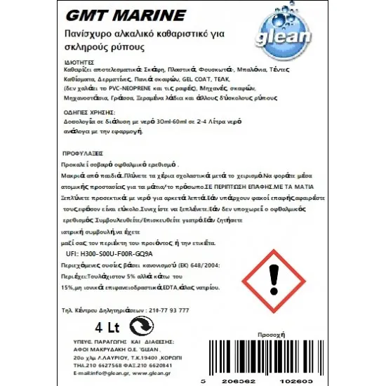 Το GMT Marine σε επαγγελματική συσκευασία 4 λίτρων είναι ένα εξαιρετικά δραστικό αλκαλικό καθαριστικό, σχεδιασμένο για την αντιμετώπιση των πιο επίμονων ρύπων σε κάθε σημείο του σκάφους. Η σύνθεσή του είναι ιδανική για βαριά χρήση σε επιφάνειες που απαιτούν βαθύ καθαρισμό χωρίς να φθείρονται τα υλικά.