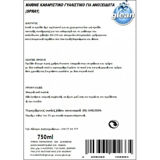 Το Glean Marine είναι ένα εξειδικευμένο προϊόν επαγγελματικών προδιαγραφών, σχεδιασμένο για τον απαιτητικό καθαρισμό και τη συντήρηση μεταλλικών επιφανειών σε περιβάλλοντα με έντονη υγρασία και αλατότητα. Είναι η ιδανική λύση για σκάφη αναψυχής, θαλάσσιο εξοπλισμό αλλά και οικιακή χρήση όπου απαιτείται κορυφαία προστασία.