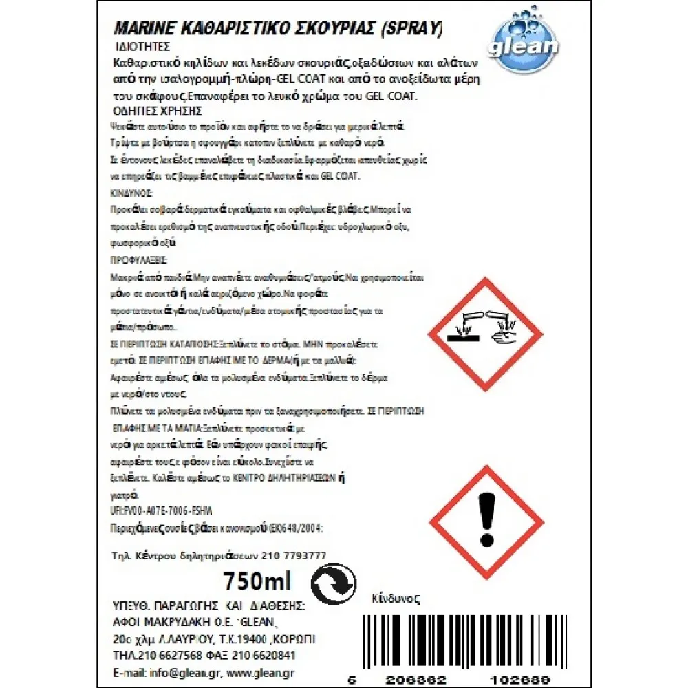 Το Glean Marine Rust Stain Remover είναι ένα πανίσχυρο καθαριστικό εξειδικευμένο για την άμεση αφαίρεση λεκέδων σκουριάς και οξειδώσεων από τις πιο απαιτητικές επιφάνειες του σκάφους. Η προηγμένη σύνθεσή του δρα γρήγορα και αποτελεσματικά, επαναφέροντας την όψη των υλικών χωρίς να φθείρει τις ευαίσθητες επιφάνειες.