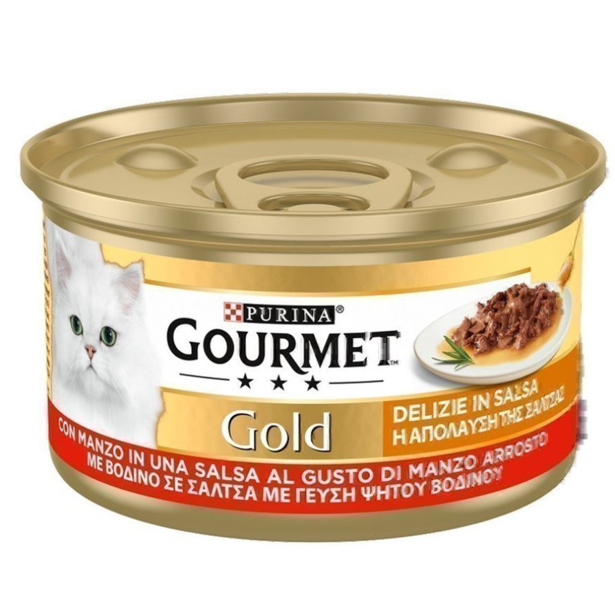 Πλήρης υγρή τροφή , κονσέρβα Purina Gourmet Gold Κομματάκια Σε Σάλτσα Με Βοδινό 85gr για ενήλικες γάτες.