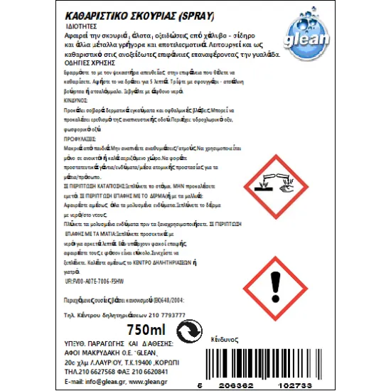 Καθαριστικό σκουριάς από ολες τις μεταλλικές , πέτρινες και μαρμάρινες επιφάνειες , καθώς και μεταλλικά εργαλεία , πλακάκια - κεραμικά σε εσωτερικούς και εξωτερικούς χώρους
