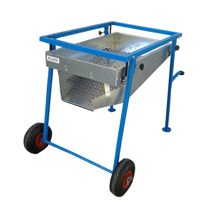 Κινούμενο κόσκινο διαλογής ελιάς και ξηρών καρπών, με καρέ θυρίδες και λεκάνη εξαγωγής. Στιβαρή κατασκευή. Γαλβανιζέ σκάφη και ειδικη λεκάνη εξαγωγής με παραλληλόγραμμες οπές. 2 τροχοί για εύκολη μεταφορά με μεγάλες πρακτικές χειρολαβές.