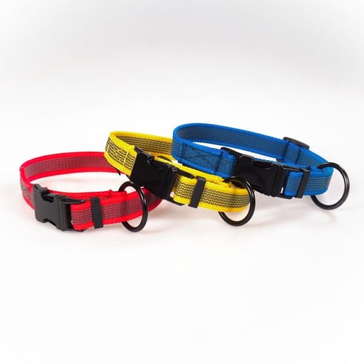 Περιλαίμια από αντιολισθητικό ιμάντα με σιδερένιο κλιπ ασφαλείας και μεταλλικό, κολλητό κρίκο.