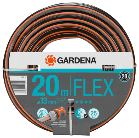 Το Λάστιχο Comfort Flex της GARDENA, με την τεχνολογία Power Grip, εγγυάται την τέλεια σύνδεση μεταξύ λάστιχου και ταχυσυνδέσμου. Χάρη στη νέα τεχνολογία λάστιχο και ταχυσύνδεσμος αλληλοσυνδέονται όπως οι οδοντωτοί τροχοί. Το Power Grip καθιστά δυνατό αυτό που πάντα επιθυμούσαν οι ιδιοκτήτες κήπων, την αξιόπιστη σύνδεση με τέλεια δύναμη συγκράτησης. Ένα θετικό στοιχείο αυτής της τεχνολογίας είναι ότι το λάστιχο διπλώνεται πιο εύκολα και σύρεται καλά. Χάρη στην ειδική πλέξη με δύο σπείρες που απλώνονται σε αντίθετες κατευθύνσεις, το εύκαμπτο λάστιχο είναι ανθεκτικό στην πίεση και διατηρεί το σχήμα του, ενώ ταυτόχρονα είναι και ευέλικτο και εύκολο στο χειρισμό. Δεν μπλέκεται σε κόμπους και δεν τσακίζει. Αυτές είναι οι καλύτερες προϋποθέσεις για μια άνετη και ευέλικτη χρήση στον κήπο σας. Εάν απαιτείται, μπορεί να συμπληρωθεί με τα εξαρτήματα και τις συσκευές σύνδεσης του Original GARDENA System. Είναι φυσικά ανθεκτικό στην υπεριώδη ακτινοβολία. Τα χοντρά τοιχώματα το καθιστούν ιδιαίτερα στιβαρό και ανθεκτικό. Πίεση: 25 bar. Εγγύηση: 20 έτη.
