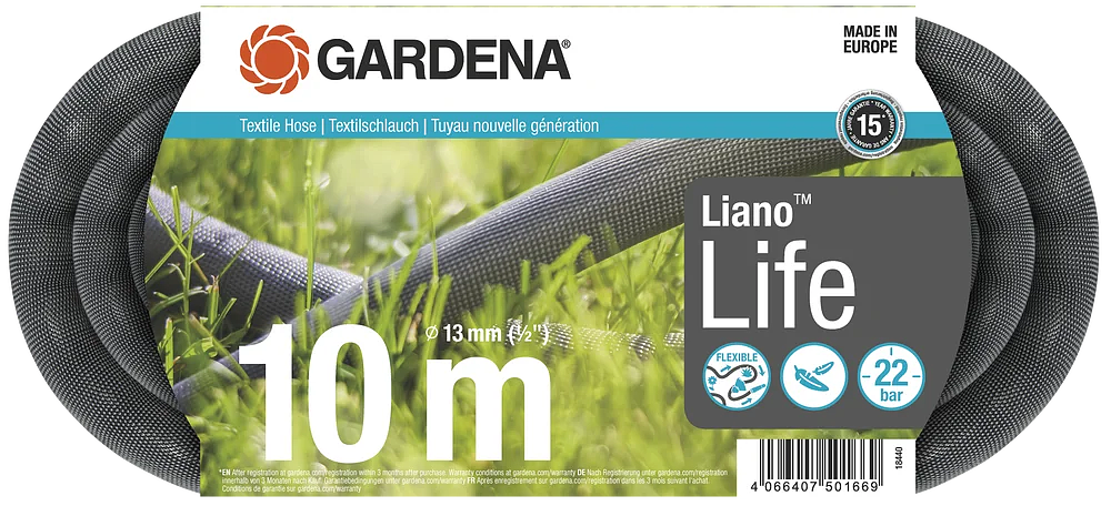 Το Υφασμάτινο Λάστιχο Liano™ Life 10 m της GARDENA είναι το ιδανικό εργαλείο για πότισμα μικρής και μεσαίας διάρκειας σε μικρούς κήπους ή μπαλκόνια. Το λάστιχο διαμέτρου 13 mm (1/2") είναι άμεσα έτοιμο για χρήση χάρη στα προσυναρμολογημένα εξαρτήματα του Original GARDENA System: Σύνδεσμος λάστιχου ποτίσματος Liano™ και Στοπ νερού Liano™, αλλά και χάρη στο εύκαμπτο ύφασμα. Ο εύκαμπτος εσωτερικός σωλήνας από PVC παρέχει αξιόπιστη απόδοση, ενώ ο πρωτοποριακός εξωτερικός σωλήνας από ανθεκτικό ύφασμα αυξάνει τη διάρκεια ζωής. Το Liano™ Life χαρακτηρίζεται από την εξαιρετική ευκαμψία του, η οποία σας βοηθά κατά την άρδευση του κήπου ή την εκτέλεση εργασιών καθαρισμού, για παράδειγμα. Οι ελιγμοί πάνω στο έδαφος γίνονται εύκολα, καθώς είναι ελαστικό οπότε έχει λιγότερο πιθανό να μαγκώσει σε εμπόδια ή να τσακίσει. Είναι κατά 50% ελαφρύτερο από τα συμβατικά λάστιχα ποτίσματος από PVC, ώστε να μπορείτε να το κρατάτε άνετα στα χέρια σας ακόμα και για μεγάλες χρονικές περιόδους. Επιπλέον, η ευχάριστη αίσθηση αφής εξασφαλίζει ο χειρισμός του γίνεται άνετα. Χάρη στη μεγάλη ευκαμψία του, το λάστιχο προσαρμόζεται εύκολα στον υπάρχοντα αποθηκευτικό χώρο που έχετε, ώστε να μπορείτε να το φυλάσσετε εύκολα και συμμαζεμένα. Η πίεση θραύσης του Liano™ Life είναι 22 bar. Καθώς το λάστιχο Liano είναι ανθεκτικό στην υπεριώδη ακτινοβολία και τον παγετό, μπορείτε να το φυλάσσετε σε εξωτερικούς χώρους σε όλη τη διάρκεια του έτους. Το Liano™ Life δεν περιέχει επιβλαβείς ουσίες, δηλαδή φθαλικές ενώσεις (<0,1%), κάδμιο, μόλυβδο και βάριο (<0,1%). Το ποιοτικό υφασμάτινο λάστιχο Liano™ Life κατασκευάζεται στην Ευρώπη και υποστηρίζεται από εγγύηση κατασκευαστή 15 ετών από την GARDENA, αφού γίνει καταχώρηση του προϊόντος στο gardena.com/registration εντός 3 μηνών από την αγορά. Κατασκευασμένο για ακραίες συνθήκες. Σχεδιασμένο για καθημερινή χρήση. Υφασμάτινα Λάστιχα Liano™.