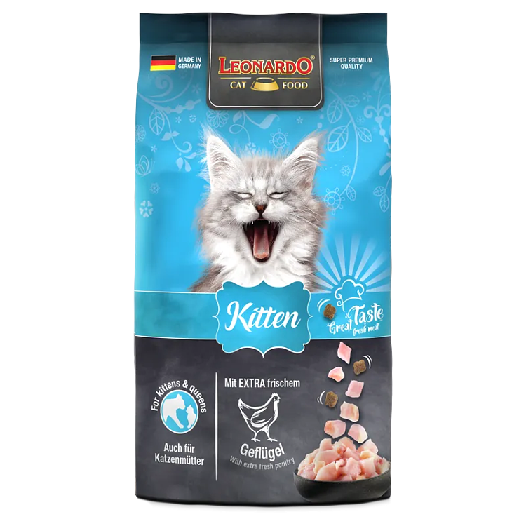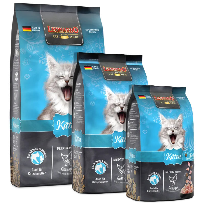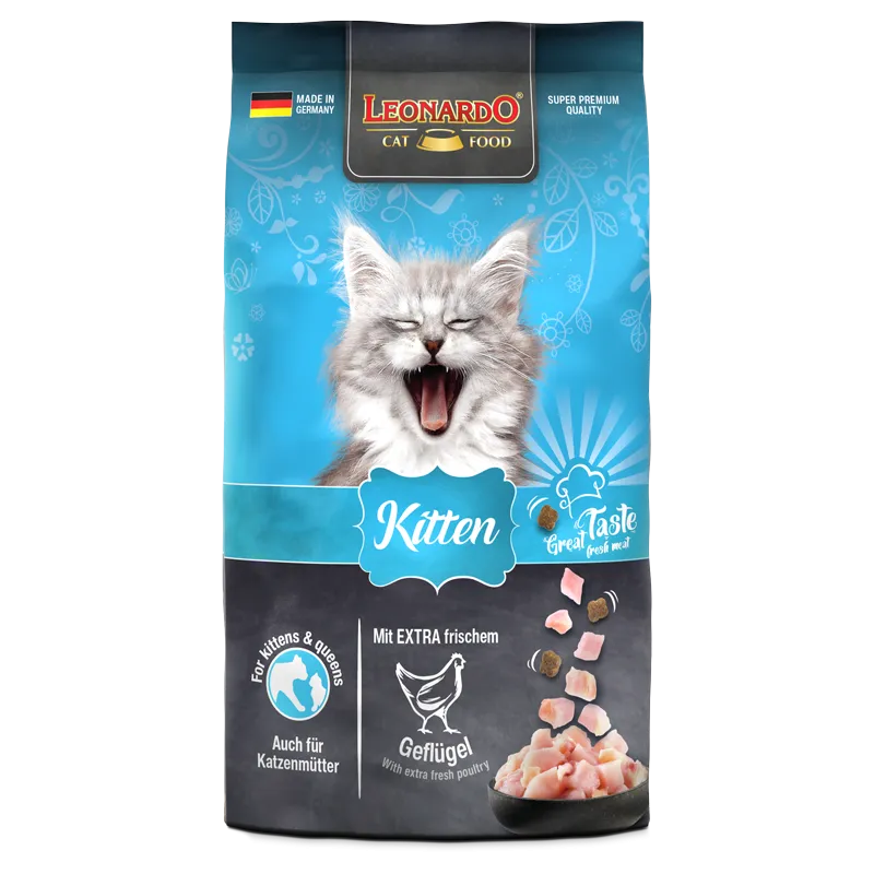 Η LEONARDO Kitten είναι ιδιαιτέρως εύκολη να αφομοιωθεί επειδή περιέχει περισσότερο φρέσκο ψαχνό κρέας κοτόπουλου, καθώς και καρπούς Chia για τη ρύθμιση του εντέρου. Κατά τους πρώτους μήνες της ζωής μιας γάτας, η καλή πέψη είναι ιδιαίτερα σημαντική για την ευημερία της. Το ανοσοποιητικό σύστημα στα νεαρά γατάκια δεν έχει αναπτυχθεί πλήρως. Η LEONARDO Kitten περιέχει το ProVital, έναν συνδυασμό ενεργών συστατικών από φυσικά εκχυλίσματα μαγιάς που υποστηρίζουν και ενισχύουν τη λειτουργία του ανοσοποιητικού συστήματος.