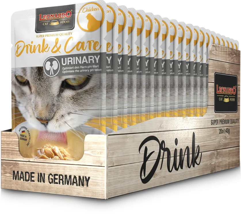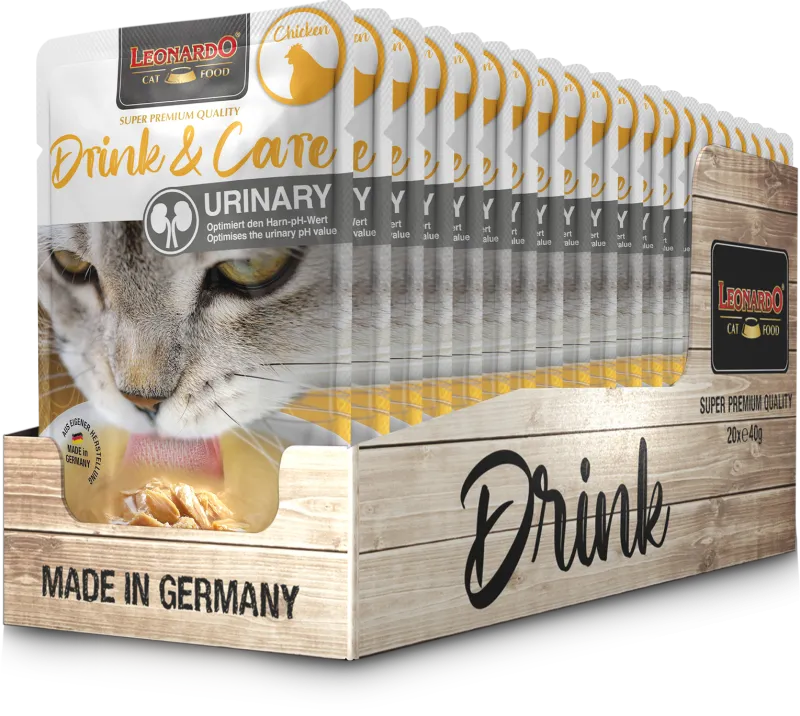 Για τους τετράποδους που δεν πίνουν εύκολα: Όσο κι αν παίζουν, μερικοί δεν διψούν συχνά. Μια μικρή γουλιά κινήτρου βοηθά να ισορροπήσει τα υγρά τους: Η νόστιμη γεύση κρέατος του LEONARDO Drink & Care Urinary Chicken διεγείρει το ένστικτο της δίψας, αυξάνει την πρόσληψη υγρών και φροντίζει την υγεία του ουροποιητικού συστήματος, βελτιστοποιώντας το pH των ούρων – γουλιά γουλιά, βελτιώνει την ευεξία.