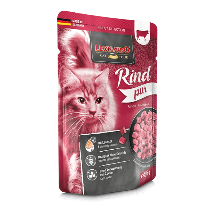 Πολλές γάτες υποφέρουν από δυσανεξία στα δημητριακά, η οποία εκδηλώνεται με συμπτώματα όπως προβλήματα δέρματος και τριχώματος, κνησμό, πεπτικά προβλήματα και διάρροια. Η Leonardo Finest Selection δεν περιέχει πρόσθετα δημητριακά, και επομένως είναι ιδανική για γάτες με διατροφικές ευαισθησίες και αλλεργίες. Οι γάτες είναι μικρά σαρκοφάγα ζώα, αξιοποιούν ιδιαίτερα καλά τις ζωικές πρωτεΐνες. Για την παρασκευή της Leonardo Finest Selection χρησιμοποιείται αποκλειστικά άριστο κρέας, το οποίο έχει αξιολογηθεί ως κατάλληλο για ανθρώπινη κατανάλωση. Προέρχεται από γερμανικές φάρμες και επεξεργάζεται νωπό από το σφαγείο. Η ρέγγα και οι γαρίδες επεξεργάζονται αμέσως μετά την αλίευσή τους, όσο είναι ακόμη φρέσκιες, και αποτελούν ιδανική πηγή ωμέγα-3 λιπαρών οξέων και πολύτιμης πρωτεΐνης. Δεδομένου ότι επεξεργάζονται μόνο πρώτες ύλες άριστης ποιότητας, αυτή η ζωοτροφή προσφέρει υψηλή βιολογική αξία. Η προσθήκη ελαίου σολομού μπορεί να υποστηρίζει την υγεία του δέρματος και του τριχώματος, καθώς το λάδι σολομού είναι μια εξαιρετική πηγή ωμέγα-3 λιπαρών οξέων. Η προσθήκη ταυρίνης μπορεί να υποστηρίζει την όραση και τη λειτουργία της καρδιάς, ενώ παράλληλα εμπλουτίζει αυτά τα γευστικά μενού με μια ουσία ζωτικής σημασίας για τις γάτες. Η Leonardo Finest Selection δεν περιέχει τεχνητές χρωστικές, αρώματα ή συντηρητικά.