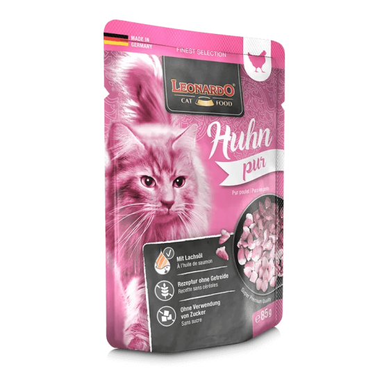 Πολλές γάτες υποφέρουν από δυσανεξία στα δημητριακά, η οποία εκδηλώνεται με συμπτώματα όπως προβλήματα δέρματος και τριχώματος, κνησμό, πεπτικά προβλήματα και διάρροια. Η Leonardo Finest Selection δεν περιέχει πρόσθετα δημητριακά, και επομένως είναι ιδανική για γάτες με διατροφικές ευαισθησίες και αλλεργίες. Οι γάτες είναι μικρά σαρκοφάγα ζώα, αξιοποιούν ιδιαίτερα καλά τις ζωικές πρωτεΐνες. Για την παρασκευή της Leonardo Finest Selection χρησιμοποιείται αποκλειστικά άριστο κρέας, το οποίο έχει αξιολογηθεί ως κατάλληλο για ανθρώπινη κατανάλωση. Προέρχεται από γερμανικές φάρμες και επεξεργάζεται νωπό από το σφαγείο. Η ρέγγα και οι γαρίδες επεξεργάζονται αμέσως μετά την αλίευσή τους, όσο είναι ακόμη φρέσκιες, και αποτελούν ιδανική πηγή ωμέγα-3 λιπαρών οξέων και πολύτιμης πρωτεΐνης. Δεδομένου ότι επεξεργάζονται μόνο πρώτες ύλες άριστης ποιότητας, αυτή η ζωοτροφή προσφέρει υψηλή βιολογική αξία. Η προσθήκη ελαίου σολομού μπορεί να υποστηρίζει την υγεία του δέρματος και του τριχώματος, καθώς το λάδι σολομού είναι μια εξαιρετική πηγή ωμέγα-3 λιπαρών οξέων. Η προσθήκη ταυρίνης μπορεί να υποστηρίζει την όραση και τη λειτουργία της καρδιάς, ενώ παράλληλα εμπλουτίζει αυτά τα γευστικά μενού με μια ουσία ζωτικής σημασίας για τις γάτες. Η Leonardo Finest Selection δεν περιέχει τεχνητές χρωστικές, αρώματα ή συντηρητικά.