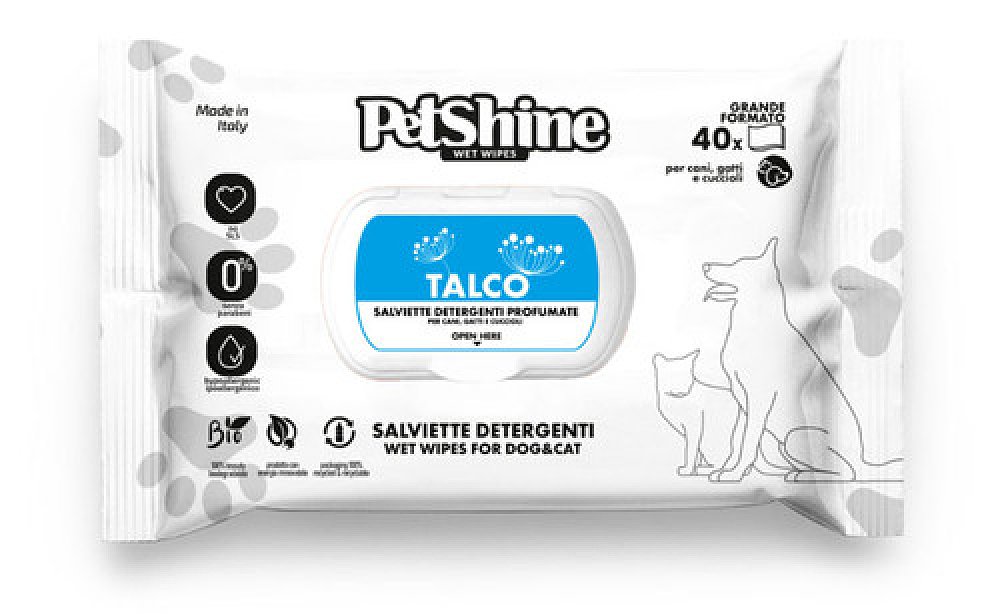 Χαρίστε στο κατοικίδιό σας την κλασική, απαλή φρεσκάδα της πούδρας με τα Υγρά Μαντηλάκια Καθαρισμού Pet Shine με Άρωμα TALCO (Πούδρα).