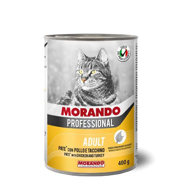 Η Morando Professional Cat Πατέ με κοτόπουλο και γαλοπούλα, προσφέρει εξαιρετική ποιότητα και γεύση για την αγαπημένη σας γάτα. Φτιαγμένη από προσεκτικά επιλεγμένα συστατικά, αυτή η πλήρης και ισχυρή τροφή εξασφαλίζει ότι η γάτα σας λαμβάνει όλες τις απαραίτητες θρεπτικές ουσίες για υγιή ανάπτυξη και ευεξία. Η απαλή υφή του πατέ και η υπέροχη γεύση του το καθιστούν ιδανικό για ενήλικες γάτες, ενώ η ισχυρή θρεπτική του σύνθεση υποστηρίζει τη σωστή λειτουργία του οργανισμού και τη διατήρηση της ενέργειας.
