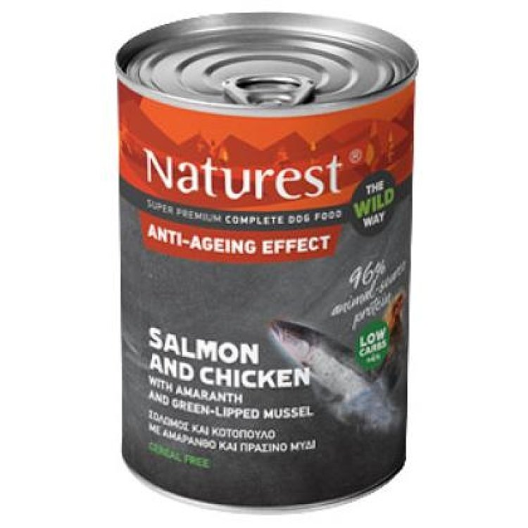 ΣΥΣΤΑΣΗ: Περιέχει επιλεγμένα φρέσκα μέρη κοτόπουλου 57% και σολωμού 10%, ζωμό 28,5%, σπόρους αμάρανθου 3%, μέταλλα 1%, λινέλαιο 0,5%, εκχύλισμα πράσινου μυδιού 0,1%. Πρωτεΐνη: 10.30%, λιπαρά: 5.60%, τέφρα: 2.50%, εδώδιμες ίνες: 0.50%, υγρασία: 79.00%, νάτριο: 0.18%, φώσφορος: 0.20%