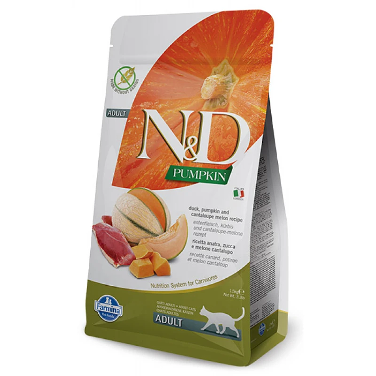 Πλήρης τροφή, χωρίς σιτηρά, με πάπια, πεπόνι και κολοκύθα, για ενήλικες γάτες. Λόγω της απουσίας δημητριακών, η τροφή έχει χαμηλό γλυκαιμικό δείκτη, γεγονός που επιτρέπει τη σταδιακή απελευθέρωση ενέργειας καθ' όλη τη διάρκεια της ημέρας. Πλούσια σε υψηλής ποιότητας πρωτεΐνες, συμπεριλαμβανομένων πολύτιμων βιταμινών, που έχουν μεγαλύτερη αποτελεσματικότητα χάρη στην τεχνολογία ψυχρής έγχυσης. Περιέχει διαλυτές ίνες και φυσικά αντιοξειδωτικά, χονδροϊτίνη και γλυκοζαμίνη που βοηθούν στην υγεία των αρθρώσεων, καθώς και φρουκτοολιγοσακχαρίτες που υποστηρίζουν την ανάπτυξη των καλών βακτηριδίων του εντέρου. Η τροφή συσκευάζεται σε προστατευτική ατμόσφαιρα με χρήση αζώτου αντί για οξυγόνο, διατηρώντας αναλλοίωτα τα θρεπτικά της συστατικά με την πάροδο του χρόνου.