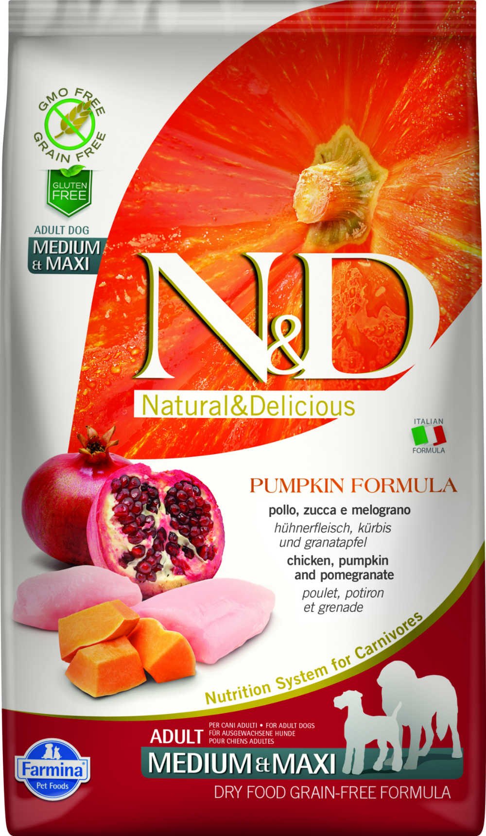 Πλήρης τροφή, χωρίς σιτηρά, με κοτόπουλο, κολοκύθα και ρόδι, για τον ενήλικο μεσαίου ή μεγάλου μεγέθους σκύλο σας. Λόγω της απουσίας δημητριακών έχει χαμηλό γλυκαιμικό δείκτη, γεγονός που επιτρέπει τη σταδιακή απελευθέρωση ενέργειας καθ' όλη τη διάρκεια της ημέρας. Πλούσια σε υψηλής ποιότητας πρωτεΐνες συμπεριλαμβανομένων πολύτιμων βιταμινών, που έχουν μεγαλύτερη αποτελεσματικότητα χάρη στην τεχνολογία ψυχρής έγχυσης. Περιέχει διαλυτές ίνες και φυσικά αντιοξειδωτικά, χονδροϊτίνη και γλυκοζαμίνη που βοηθούν στην υγεία των αρθρώσεων καθώς και φρουκτοολιγοσακχαρίτες που βοηθούν στην ανάπτυξη των καλών βακτηριδίων του εντέρου. Η τροφή συσκευάζεται σε προστατευτική ατμόσφαιρα με τη χρήση αζώτου αντί για οξυγόνο και έτσι τα θρεπτικά συστατικά της διατηρούνται αναλλοίωτα με την πάροδο του χρόνου. Πρόκειται για μια γευστική τροφή, υψηλής βιολογικής αξίας, η οποία είναι πλούσια σε θρεπτικά συστατικά που ανταποκρίνονται στις ειδικές ανάγκες του σκύλου σας.