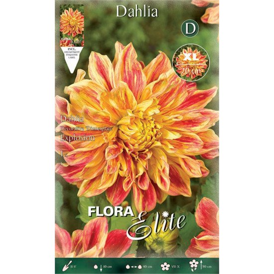 Δίχρωμη Ντάλια με πελώριο άνθος, μεγέθους πιάτου 30 εκ. σε κίτρινο – κόκκινο χρώμα. Βολβώδες φυτό ανοιξιάτικης φύτευσης το ύψος του οποίου μπορεί να φτάσει τα 0,90 μέτρα. Η κάθε συσκευασία περιέχει 1 βολβό.