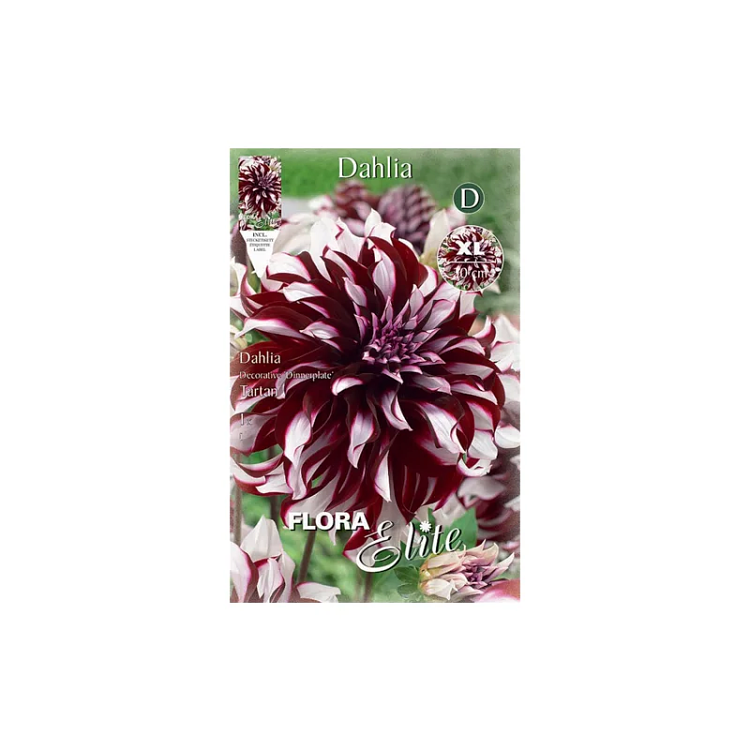 Δίχρωμη Ντάλια με πελώριο άνθος, μεγέθους πιάτου 30 εκ. σε μπορντω – λευκό χρώμα. Βολβώδες φυτό ανοιξιάτικης φύτευσης το ύψος του οποίου μπορεί να φτάσει τα 0,80 μέτρα. Η κάθε συσκευασία περιέχει 1 βολβό.