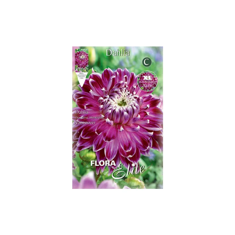 Δίχρωμη Ντάλια με πελώριο άνθος, μεγέθους πιάτου 30 εκ. σε μωβ – λευκό χρώμα. Βολβώδες φυτό ανοιξιάτικης φύτευσης το ύψος του οποίου μπορεί να φτάσει τα 1,10 μέτρα. Η κάθε συσκευασία περιέχει 1 βολβό.