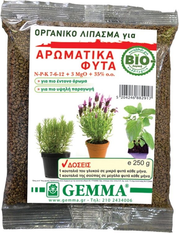 Το οργανικό λίπασμα για αρωματικά φυτά της Gemma με υψηλή περιεκτικότητα σε κάλιο, είναι η ιδανική λύση διατροφής για όλα τα αρωματικά φυτά σας. Η σύνθεση του ενισχύει τη πλούσια ανάπτυξη του φυλλώματος ιδίως μετά από πολλαπλές κοπές καθώς και την ανθοφορία. Εμπλουτισμένο με Μαγνήσιο χαρίζει έντονο πράσινο χρώμα και πιο έντονο άρωμα με φυσικό τρόπο.