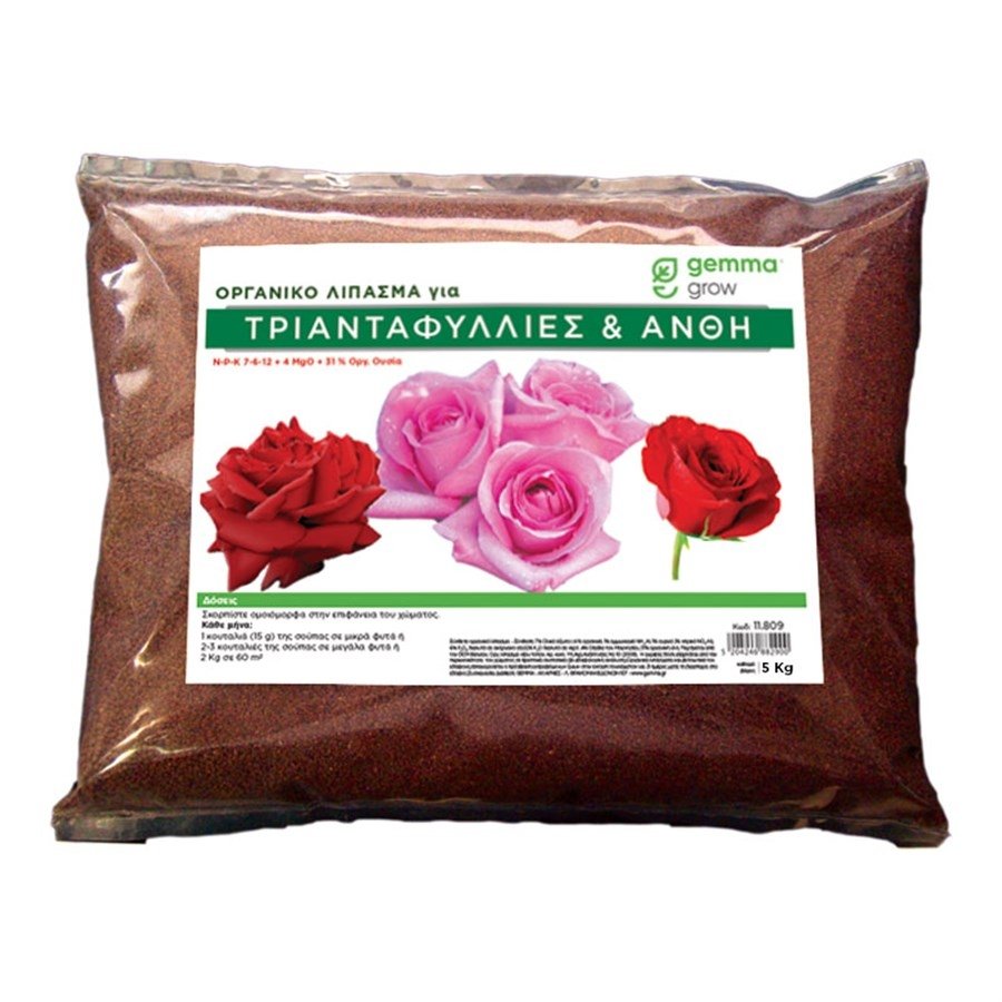Το οργανικό λίπασμα για τριανταφυλλιές-άνθη της Gemma  με υψηλή περιεκτικότητα σε κάλιο, είναι η ιδανική πηγή διατροφής για καλλιέργειες που σχηματίζουν πλούσια ανθοφορία. Η ήπια δράση του εξασφαλίζει την αποφυγή 'καψίματος' του φυτού και η βραδεία αποδέσμευση του παρέχει σταδιακά και σε ίση ποσότητα τα θρεπτικά συστατικά. Εξασφαλίζει στα φυτά αυξημένη ανθεκτικότητα στο κρύο, την ξηρασία και τις κακουχίες. Η οργανική ουσία που περιέχει είναι άριστη πηγή ενέργειας για τα διάφορα ωφέλιμα είδη βακτηρίων του εδάφους που ευνοούν τη γονιμότητα του.