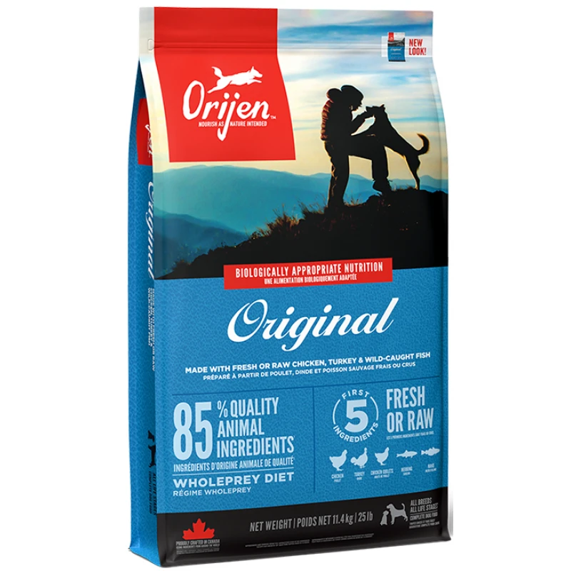 Ολιστική ξηρά τροφή σκύλου Orijen Adult Original χωρίς δημητριακά, πλούσια σε κοτόπουλο και γαλοπούλα ελευθέρας βοσκής, ψάρια αλιευμένα στη φύση και αυγά από φωλιές. Όλα παραδίδονται ΦΡΕΣΚΑ ή ΩΜΑ σε πλούσιες θρεπτικά WHOLEPREY™ αναλογίες για φυσική και πλήρη θρέψη του σκύλου σας.