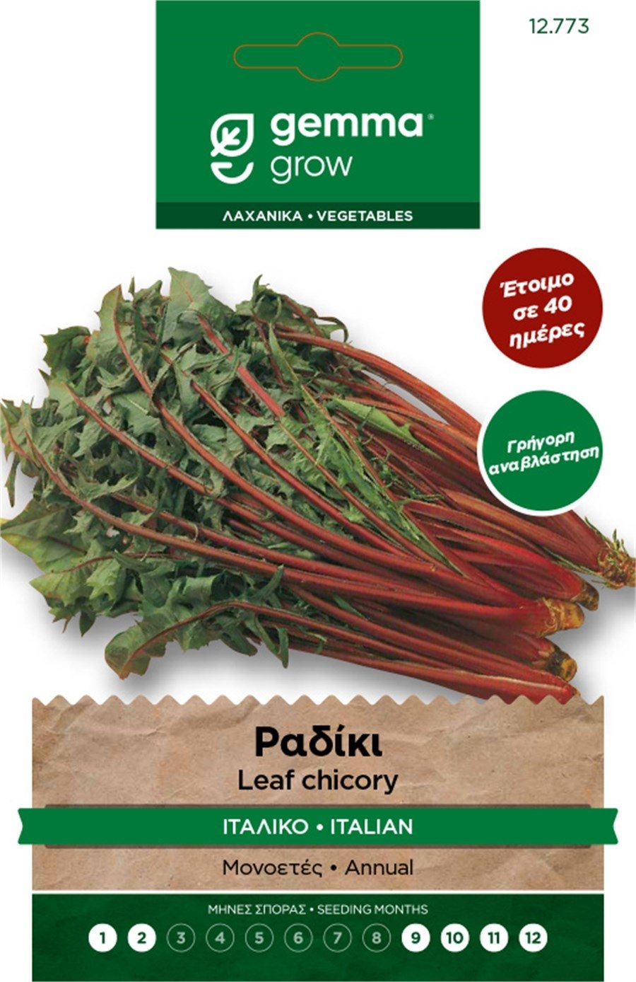 Γρήγορη αναβλάστηση. Έτοιμο σε 40 ημέρες. Μονοετές. Ποικιλία με φύλλα επιμήκη, χρώματος πράσινου σκούρου με κόκκινο στέλεχος. Συνεχής συγκομιδή, γρήγορη αναβλάστηση. Απόσταση φυτών (εκ.): 6-8. Απόσταση γραμμών (εκ.): 30-40. Βάθος σποράς (εκ.):0,5-1,5. Ημέρες φυτρώματος: 10-12. Έναρξη συγκομιδής (ημέρες): 40. Ποικιλία: Italico a Costa Rossa. 1751
