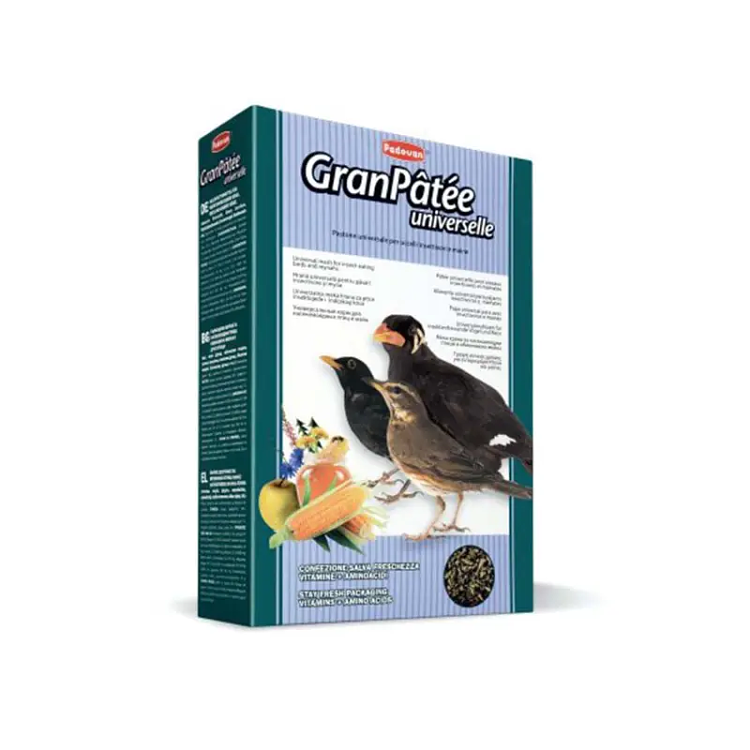 Η Padovan GranPâtée Universelle είναι μια πλήρης τροφή για εντομοφάγα πτηνά, μάινες και άλλα πουλιά (κοτσύφι, τσίχλα, ψαρόνι, skylark, fieldfare, ιαπωνικό αηδόνι, κοκκινοπούλια κ.λπ.) με μέλι, πρόσθετες βιταμίνες και αμινοξέα.