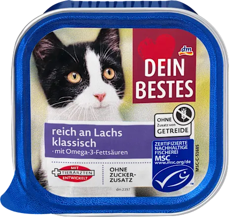Η υγρή τροφή Dein Bestes με σολομό προσφέρει ποικιλία στη διατροφή των ενήλικων γατών. Παρασκευάζεται σε συνεργασία με κτηνιάτρους και περιέχει ωμέγα-3 λιπαρά οξέα, βιοτίνη και ταυρίνη, τα οποία παίζουν ουσιαστικό ρόλο στην όραση και την καρδιακή λειτουργία, ενώ παράλληλα συμβάλλουν στη διατήρηση της υγείας του δέρματος και του λαμπερού τριχώματος του μικρού σας φίλου. Επιπλέον, το προϊόν δεν περιέχει δημητριακά, πρόσθετα σάκχαρα, συντηρητικά, χρωστικές ουσίες και αρώματα. Μια νόστιμη λιχουδιά για το μικρό σας αιλουροειδές!