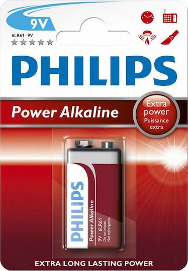 Αλκαλική μπαταρία της Philips μεγέθους 9V, ιδανική για φακούς κι άλλες οικιακές συσκευές.