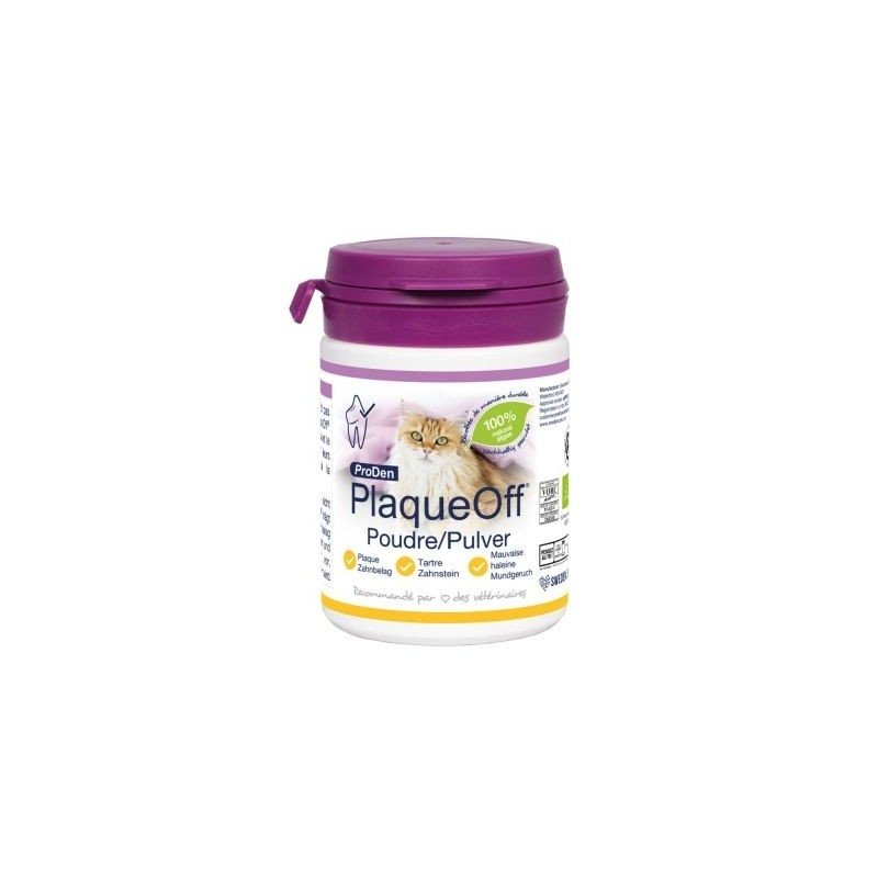 Φυσικό συμπλήρωμα διατροφής κατά της οδοντικής πλάκας, της πέτρας και της κακοσμίας κατάλληλο για όλες τις ενήλικες γατούλες. Το Proden Plaque Off είναι ένα εξαιρετικά αποτελεσματικό συμπλήρωμα καθώς συμβάλλει με βέλτιστο και φυσικό τρόπο στην εξάλειψη της κακοσμίας, της οδοντικής πλάκας και της υπάρχουσας πέτρας. Έτσι θα παρατηρήσετε αισθητή βελτίωση από την 3η εβδομάδα χρήσης! Βοηθάει τους μικρούς μας φίλους ώστε το στόμα τους να παραμένει γερό και υγιές. Μπορεί να χρησιμοποιηθεί και προληπτικά και είναι πανεύκολο στη χρήση αφού απλά τοποθετείται στο φαγητό του κατοικιδίου σας. Είναι απολύτως φυσικό προϊόν και δεν προκαλεί παρενέργειες, ενώ είναι εξαιρετικά εύγευστο με αποτέλεσμα να τρώγεται πανεύκολα από τη γατούλα σας