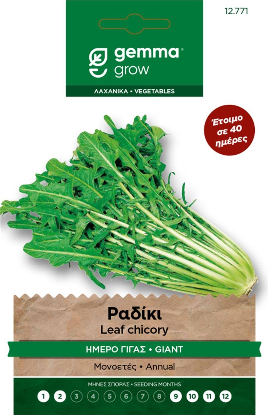 Έτοιμο σε 40 ημέρες. Μονοετές. Φύλλα επιμήκη, μεγάλα, έντονα οδοντωτά, χρώματος πράσινου. Δυνατότητα σποράς και την άνοιξη χωρίς κίνδυνο πρόωρης άνθισης. Απόσταση φυτών (εκ.): 6-8. Απόσταση γραμμών (εκ.): 30-50. Βάθος σποράς (εκ.):0,5-1,5. Ημέρες φυτρώματος: 10-12. Έναρξη συγκομιδής (ημέρες): 40. Ποικιλία: Catalogna gigante di Chioggia. 1731