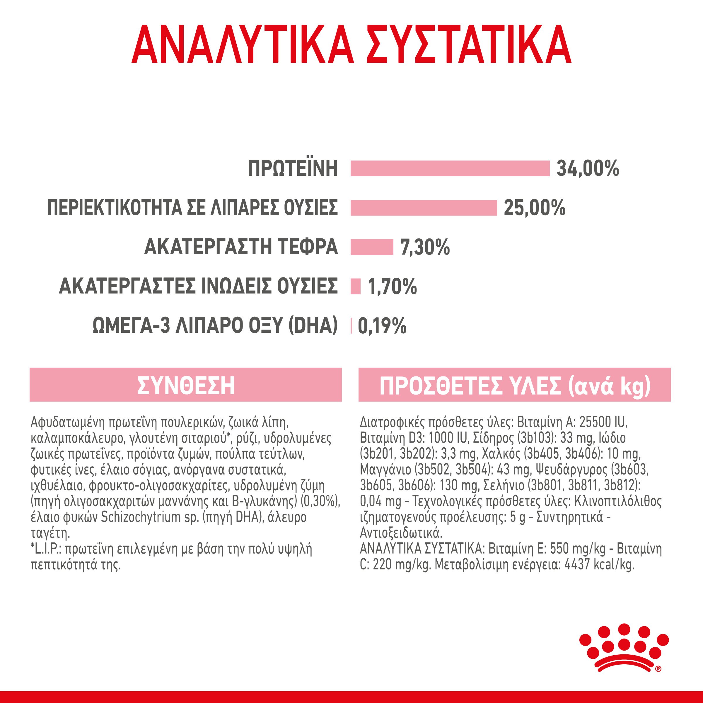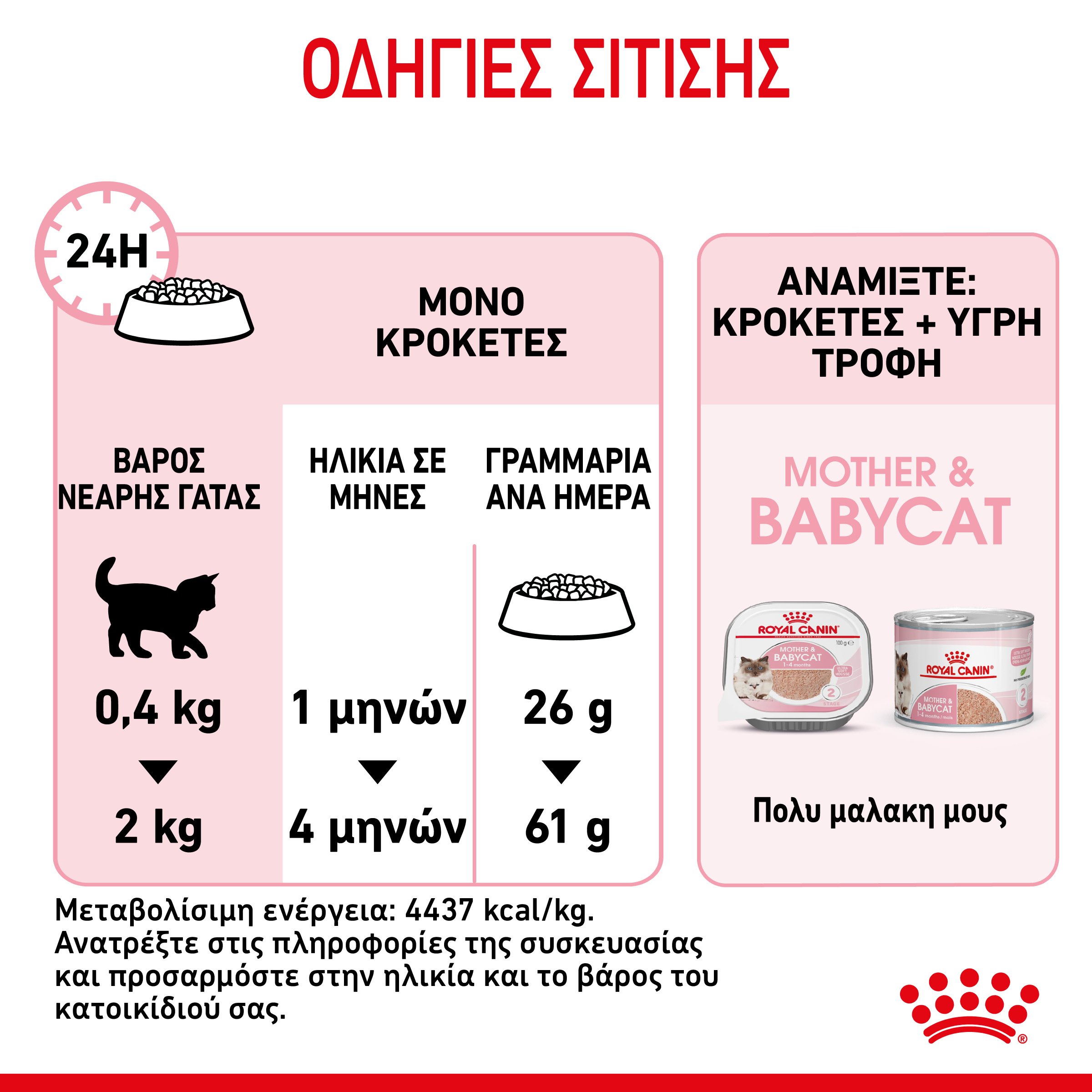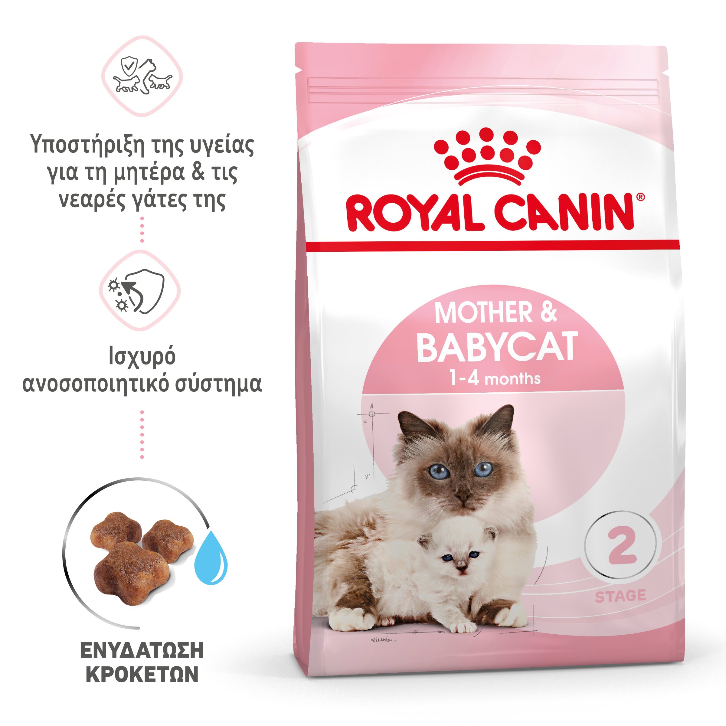 Η ROYAL CANIN® Mother & Babycat είναι ειδικά προσαρμοσμένη για να καλύπτει τις υψηλές ενεργειακές ανάγκες της γάτας σας στο τέλος της κύησης και κατά τη διάρκεια της γαλουχίας. Έχει επίσης σχεδιαστεί για να υποστηρίζει την υγιή ανάπτυξη των νεαρών γατών που θηλάζουν ηλικίας έως 4 μηνών. Περιέχει ένα αποδεδειγμένο σύμπλεγμα που περιλαμβάνει βιταμίνες C και E για την υποστήριξη της υγιούς ανάπτυξης του ανοσοποιητικού συστήματος. Αυτή η φόρμουλα είναι εμπλουτισμένη με Ωμέγα-3 λιπαρά οξέα (DHA) για την υποστήριξη της ανάπτυξης του εγκεφάλου και την ενίσχυση της υγιούς όρασης σε νεαρές γάτες. Χάρη σε ένα συνδυασμό ωφέλιμων πρεβιοτικών (MOS) και εξαιρετικά εύπεπτων πρωτεϊνών, η ROYAL CANIN® Mother & Babycat βοηθά επίσης στην υποστήριξη μιας υγιούς ισορροπίας της εντερικής μικροχλωρίδας (χλωρίδα του εντέρου) για καλή πέψη. Η κροκέτα στο ROYAL CANIN® Mother & Babycat ενυδατώνεται εύκολα με νερό, δίνοντάς της μια εύγευστη υφή χυλού που είναι ιδανική για τον απογαλακτισμό των γατών και την υποστήριξη της ενυδάτωσης τους. Στο σύντομο χρονικό διάστημα των 16 εβδομάδων, οι νεαρές γάτες σας θα χρειαστούν μια δίαιτα που θα είναι ειδικά προσαρμοσμένη για να καλύπτει τις διατροφικές τους ανάγκες κατά την επόμενη φάση ανάπτυξης. Σε αυτό το στάδιο, μπορείτε να τα βοηθήσετε να μεταβούν σε δίαιτες ROYAL CANIN® KITTEN. Αυτή είναι διαθέσιμη ως ξηρή τροφής ή ως υγρή σε κομματάκια σε σάλτσα, ζελέ ή πατέ.