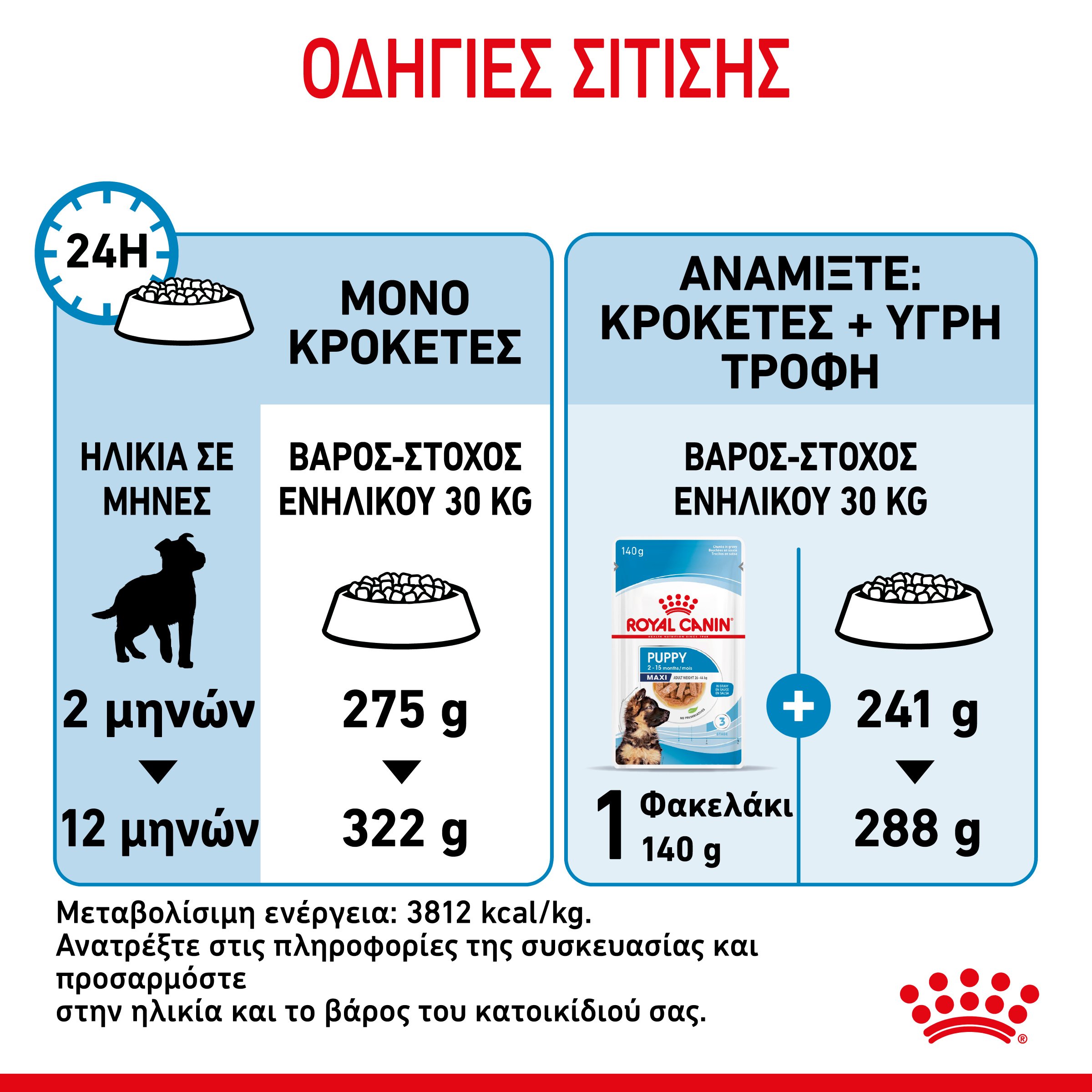 Η ROYAL CANIN® Maxi Puppy είναι ειδικά σχεδιασμένη για να υποστηρίζει τις διατροφικές ανάγκες των μεγαλόσωμων κουταβιών. Αυτή η φόρμουλα είναι κατάλληλη για κουτάβια 2 έως 15 μηνών που θα πρέπει να φτάσουν σε ενήλικο βάρος 26-44 κιλά. Αυτή η προσαρμόσμένη δίαιτα περιέχει θρεπτικά συστατικά όπως βιταμίνη C και Ε, τα οποία αποδεδειγμένα υποστηρίζουν την ανάπτυξη του υγιούς ανοσοποιητικού συστήματος ενός κουταβιού. Είναι εμπλουτισμένη με ωμέγα-3 λιπαρά οξέα (όπως το DHA) που έχει αποδειχθεί επιστημονικά ότι βοηθούν στην υποστήριξη της υγιούς ανάπτυξης του εγκεφάλου στα κουτάβια. Ένας συνδυασμός ωφέλιμων πρεβιοτικών (όπως FOS, MOS και πολτός τεύτλων) και εξαιρετικά εύπεπτων πρωτεϊνών συμβάλλει στην υποστήριξη μιας υγιούς ισορροπίας της εντερικής μικροχλωρίδας (χλωρίδα του εντέρου) για καλή πέψη. Η φόρμουλα περιέχει επίσης ένα βέλτιστο ενεργειακό περιεχόμενο που έχει σχεδιαστεί για να ικανοποιεί τις ενεργειακές ανάγκες των αναπτυσσόμενων κουταβιών μεγαλόσωμων φυλών. Η κροκέτα στο ROYAL CANIN® Maxi Puppy έχει σχεδιαστεί ειδικά για τις μοναδικές ανάγκες κουταβιών μεγαλόσωμων φυλών. Το μέγεθος και το σχήμα της βοηθούν στη ρύθμιση της ταχύτητας με την οποία το κουτάβι σας τρώει και προάγει την κορεσμό. Ένα μηχανικό αποτέλεσμα βουρτσίσματος, βοηθά στην υποστήριξη της οδοντικής υγείας καθώς το κουτάβι σας μασάει την τροφή του. Όταν το κουτάβι σας φτάσει τους 15 μήνες, θα χρειαστεί μια δίαιτα που να είναι ειδικά προσαρμοσμένη για να καλύψει τις διατροφικές του ανάγκες ως ενήλικος σκύλος. Σε αυτό το στάδιο, μπορείτε να το βοηθήσετε να μεταβεί στο ROYAL CANIN® Maxi Adult, διαθέσιμο είτε ως ξηρή τροφή είτε σε κομμάτάκια σε σάλτσα σε υγρή μορφή.